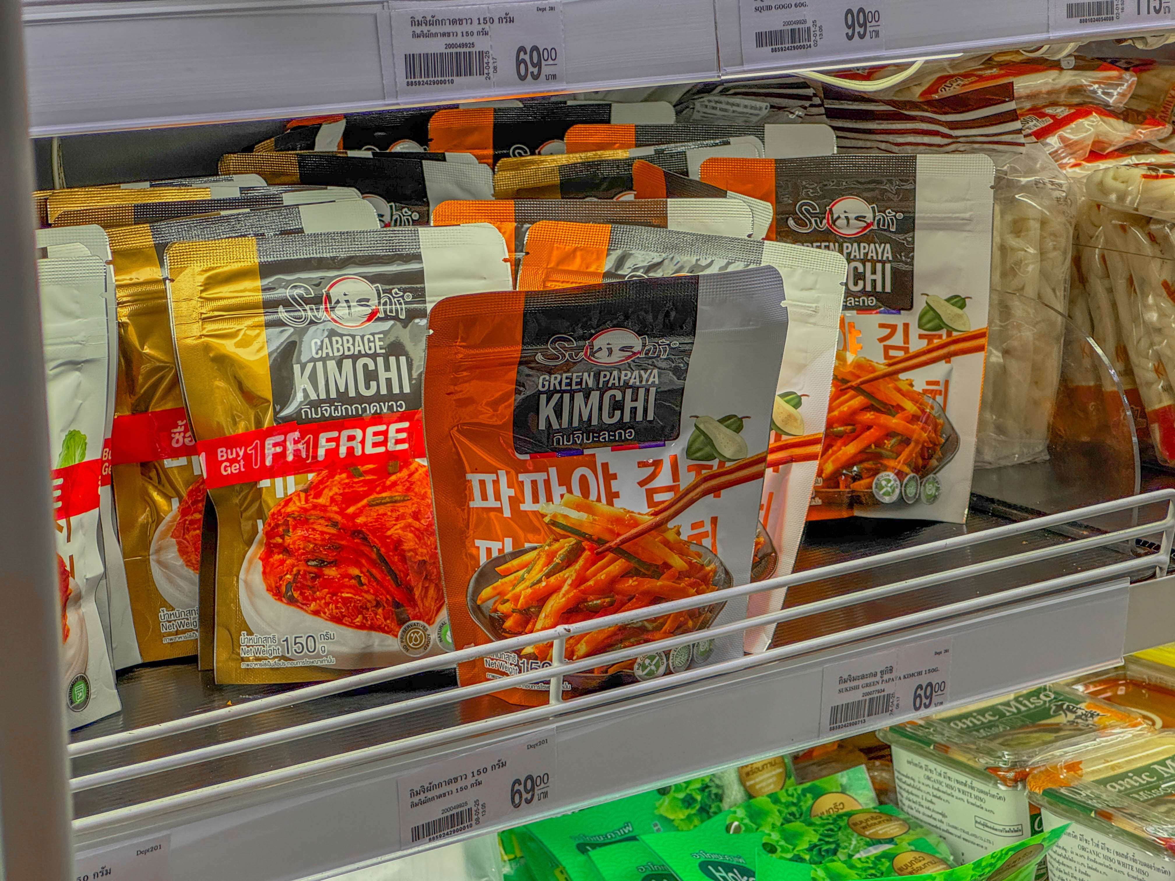 파파야로 만든 김치인데 포장지에 한글로 "파파야 김치"라고 적혀있어요! 태국에서 한글 보니까 왠지 반갑더라고요.
