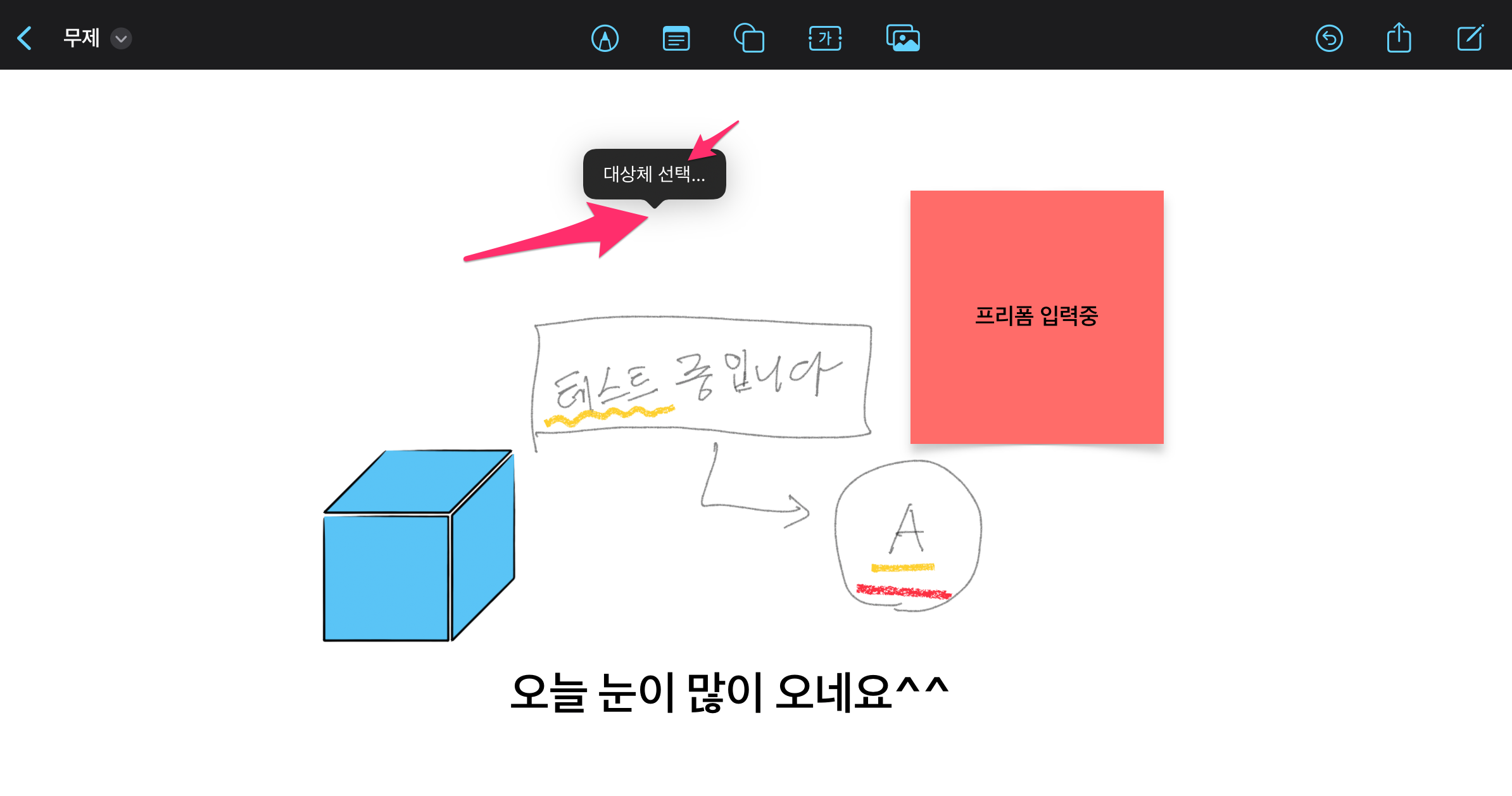 상단 중앙에는 5개의 도구(필기, 스티커 메모, 도형, 텍스트, 미디어)가 있습니다.