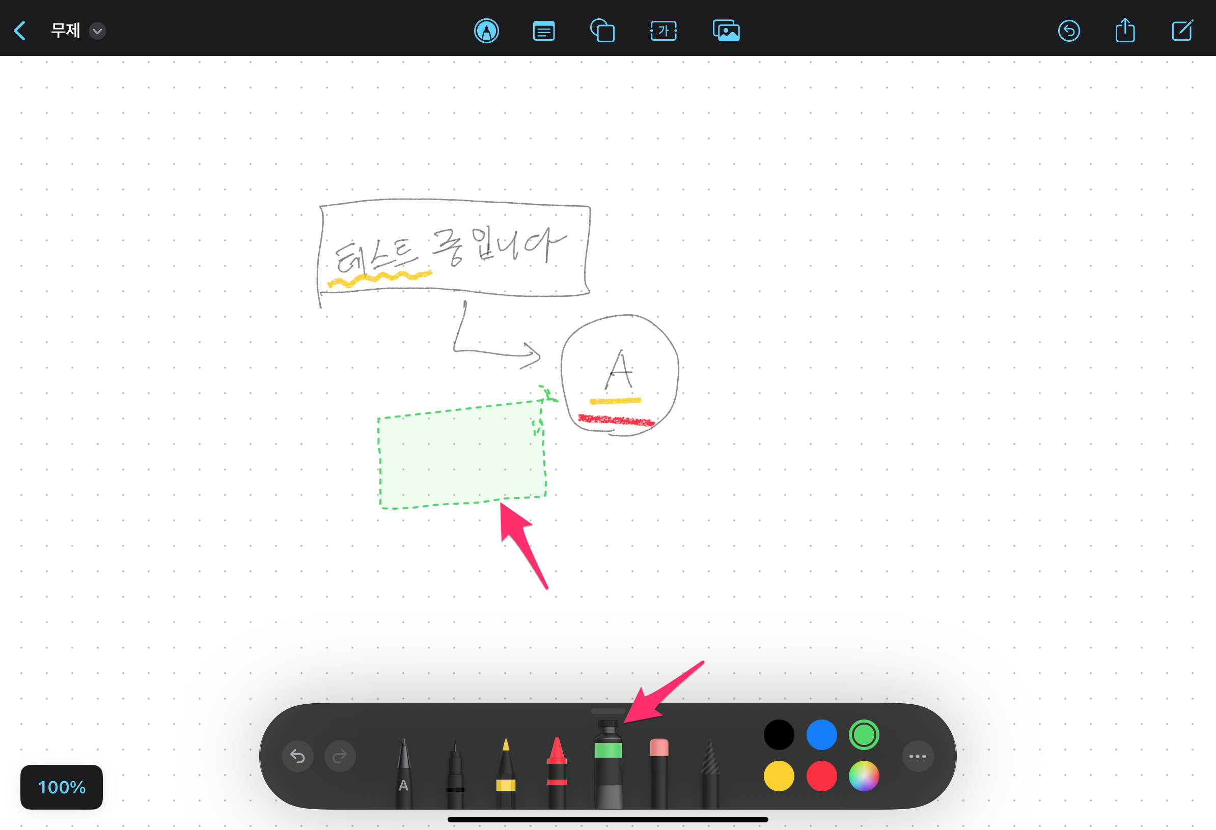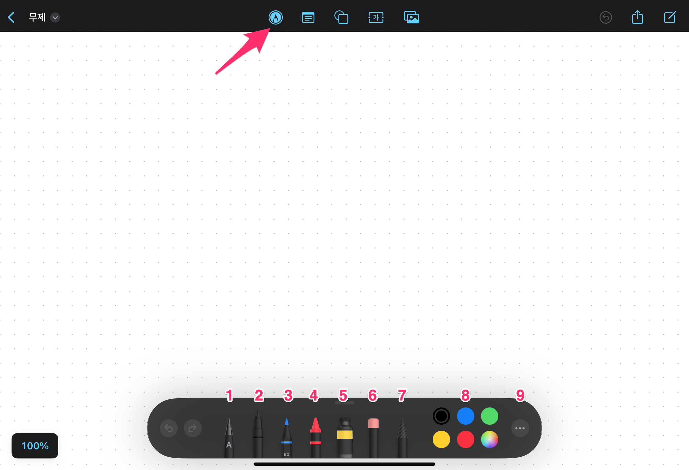 하단에 필기 옵션을 보시면 다양한 펜과 팔레트가 있습니다.
