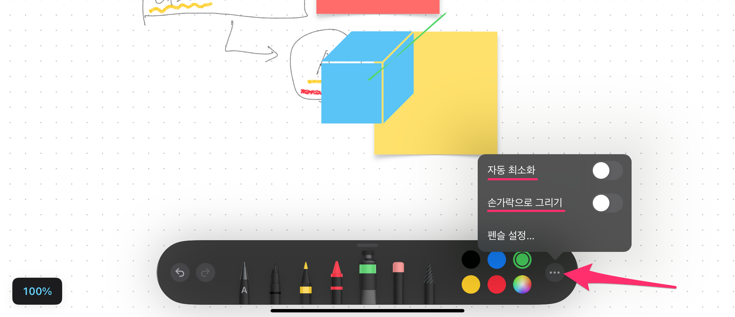 하단에 필기 옵션을 보시면 다양한 펜과 팔레트가 있습니다.