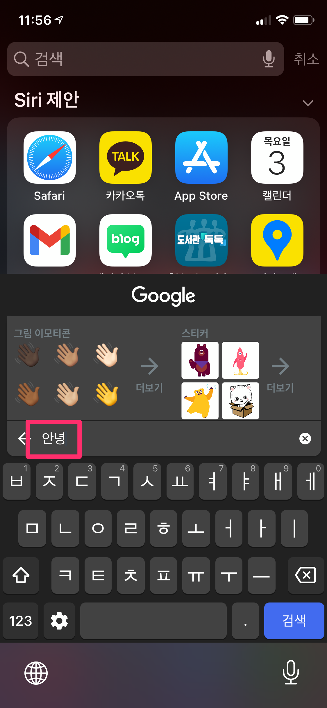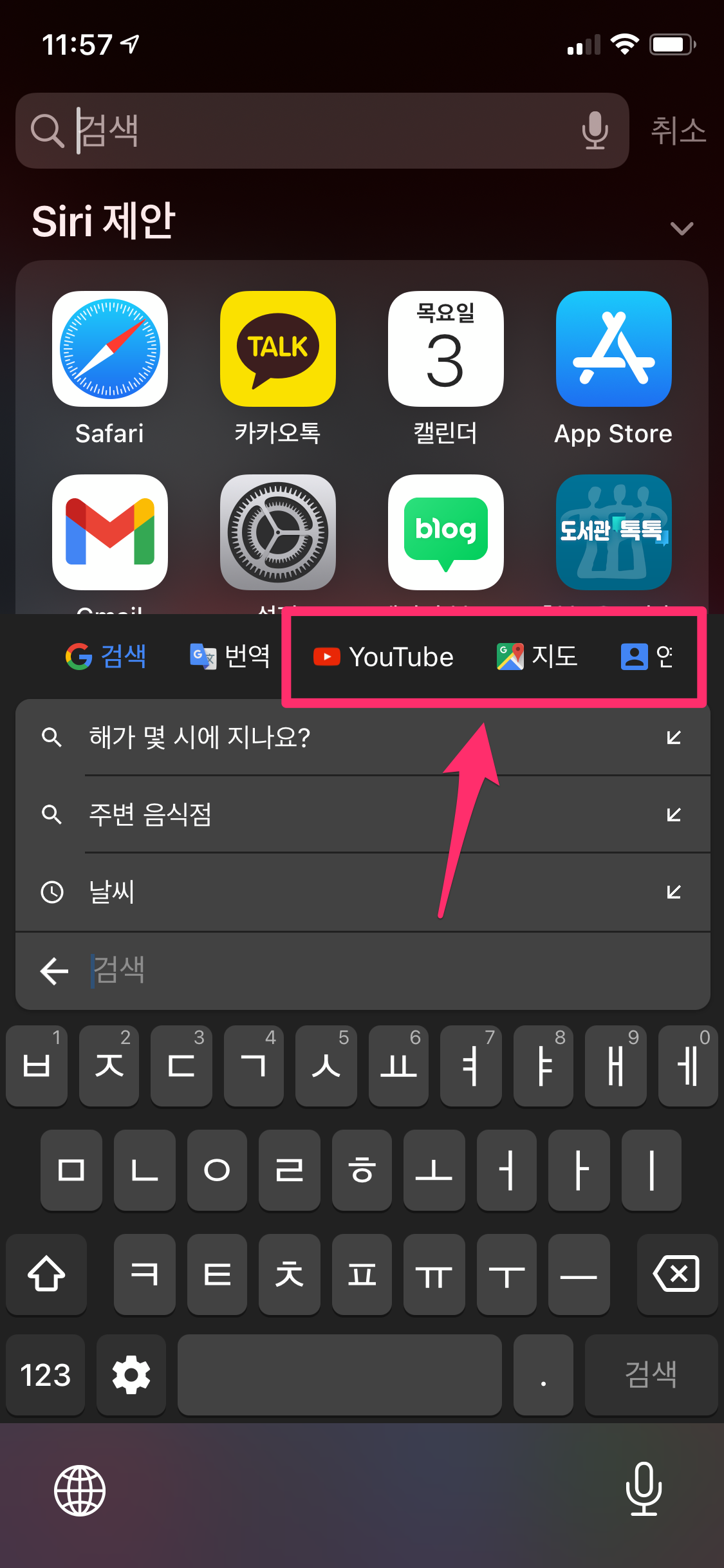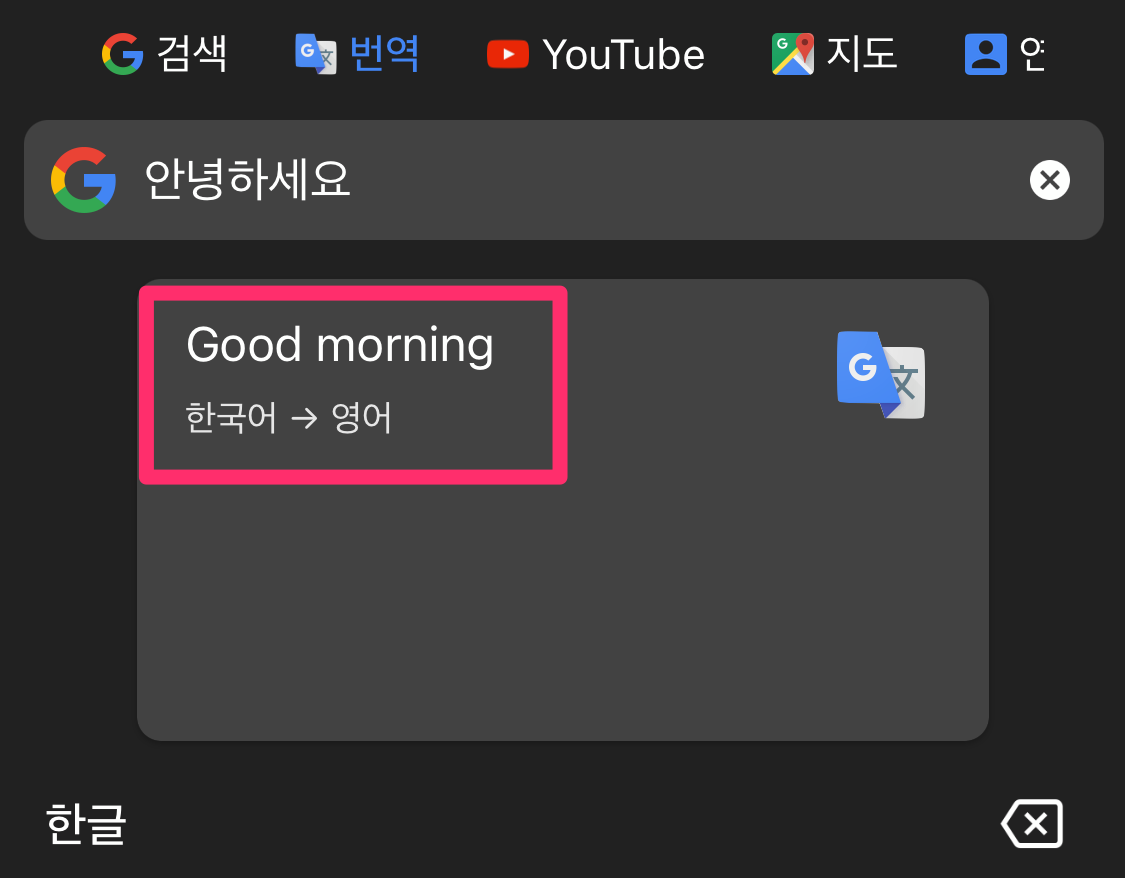 또한 구글 아이콘(G)를 누르면 상단에 유튜브, 지도, 연락처 검색도 가능합니다.