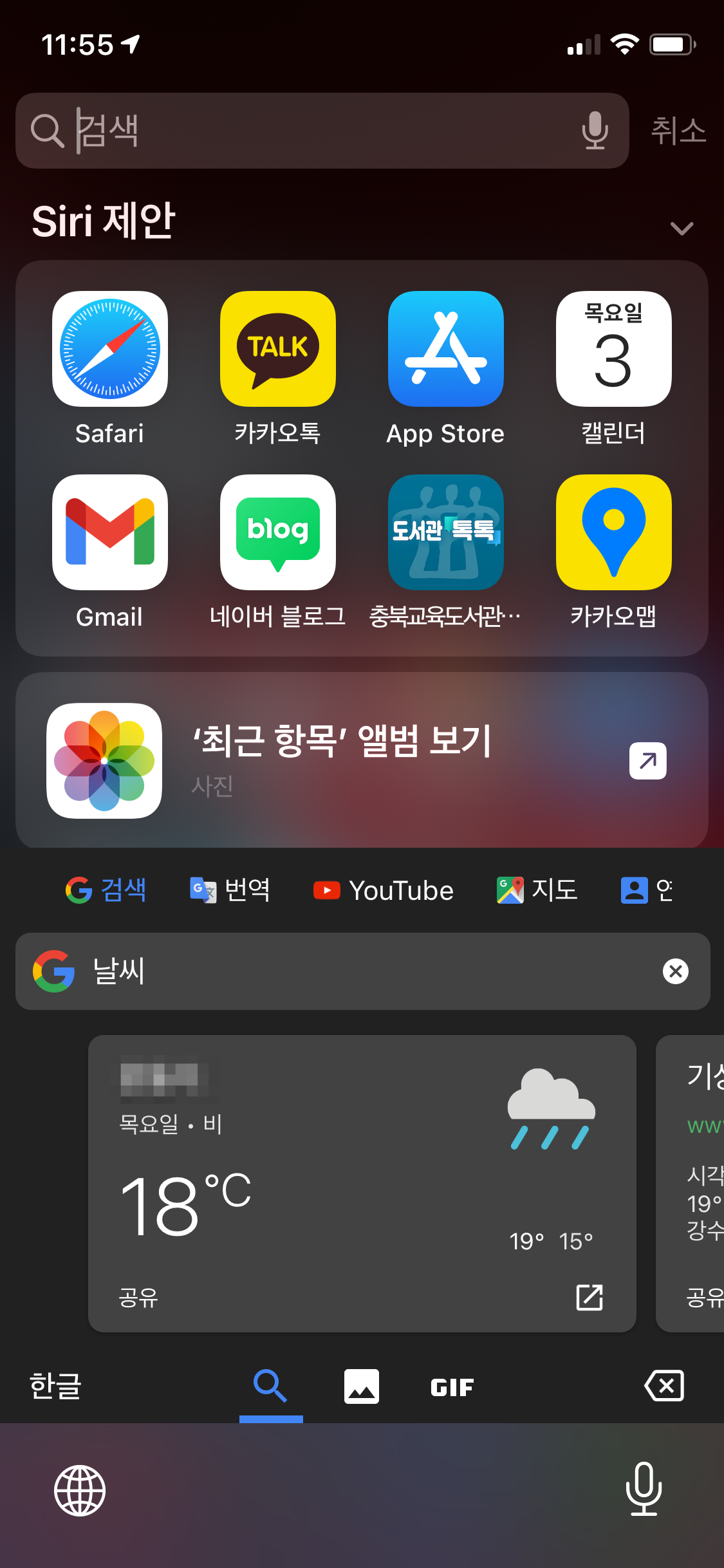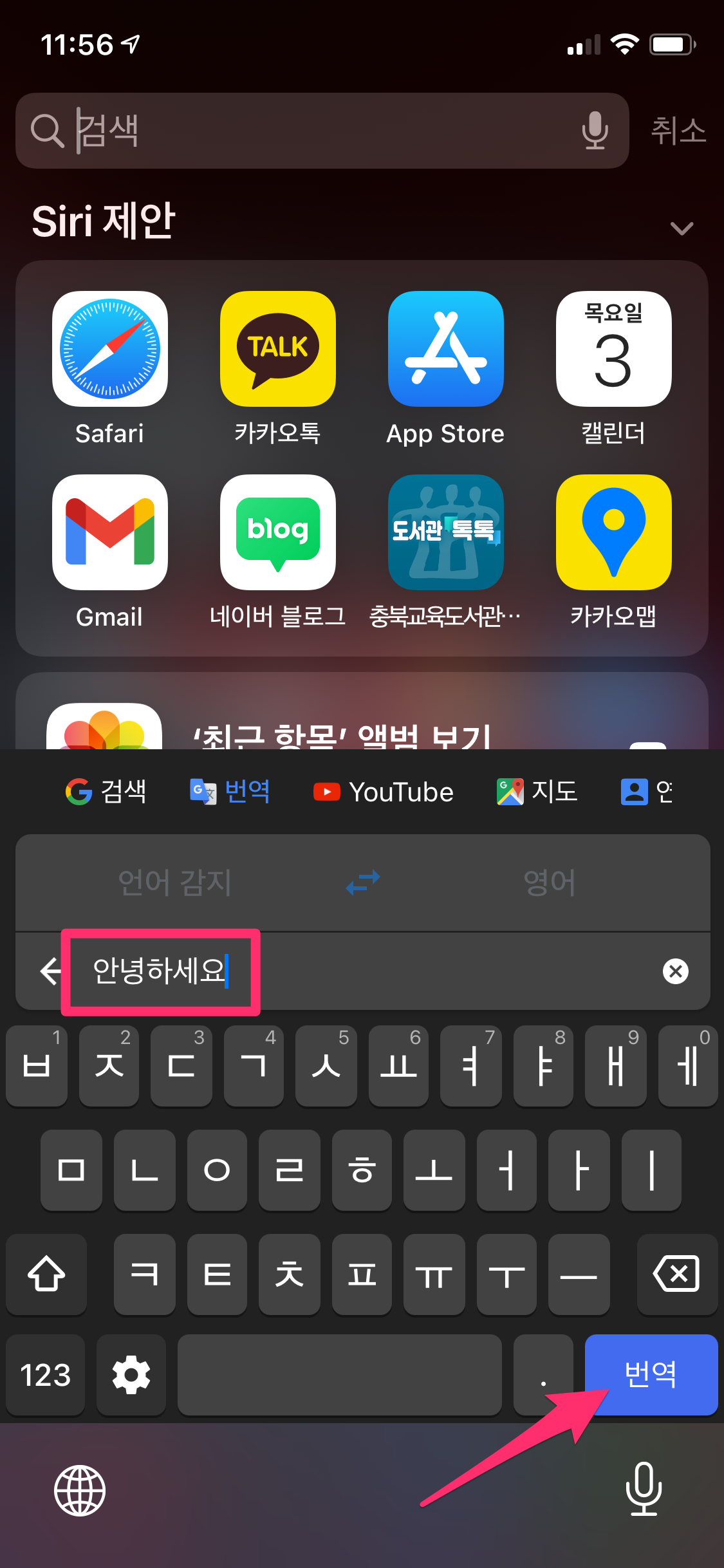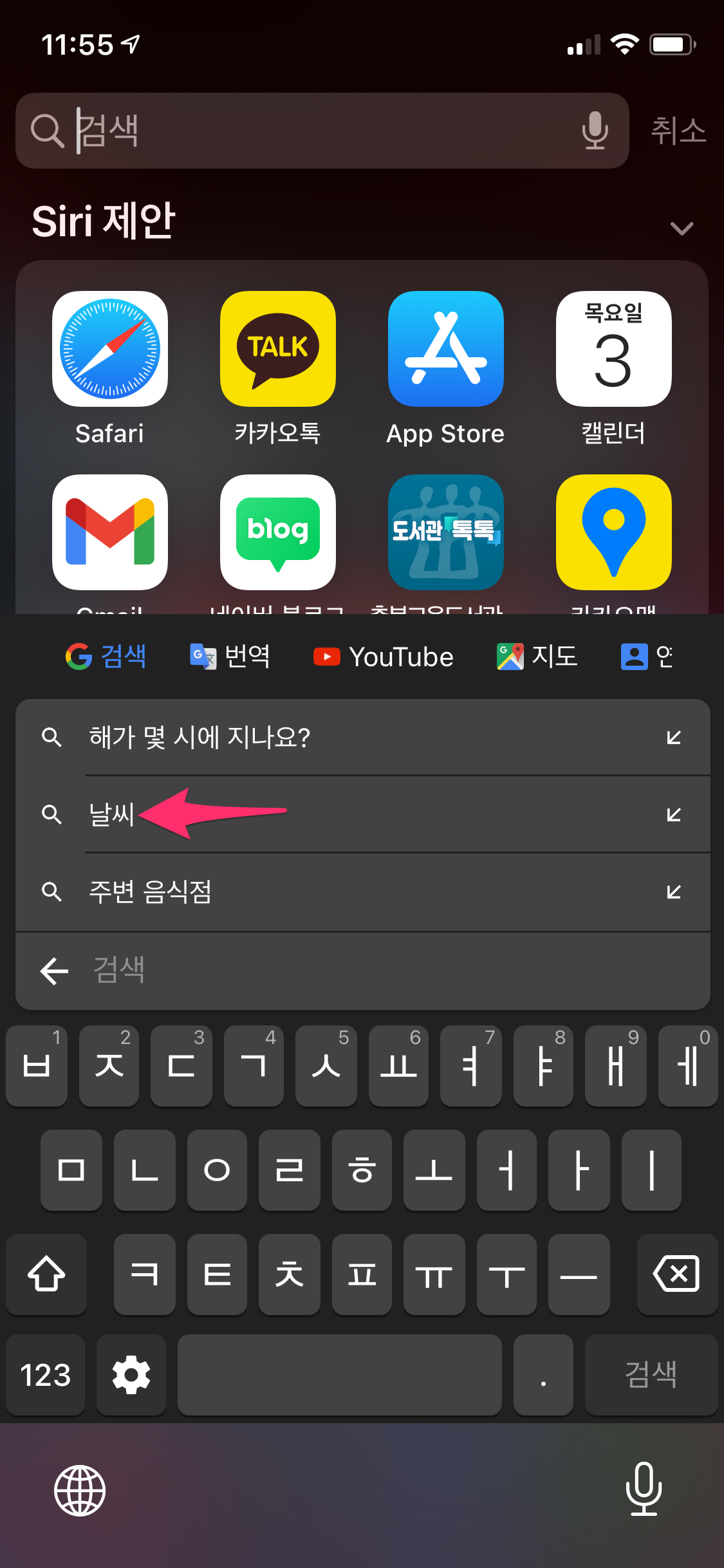또한 구글 아이콘(G)를 누르면 상단에 유튜브, 지도, 연락처 검색도 가능합니다.