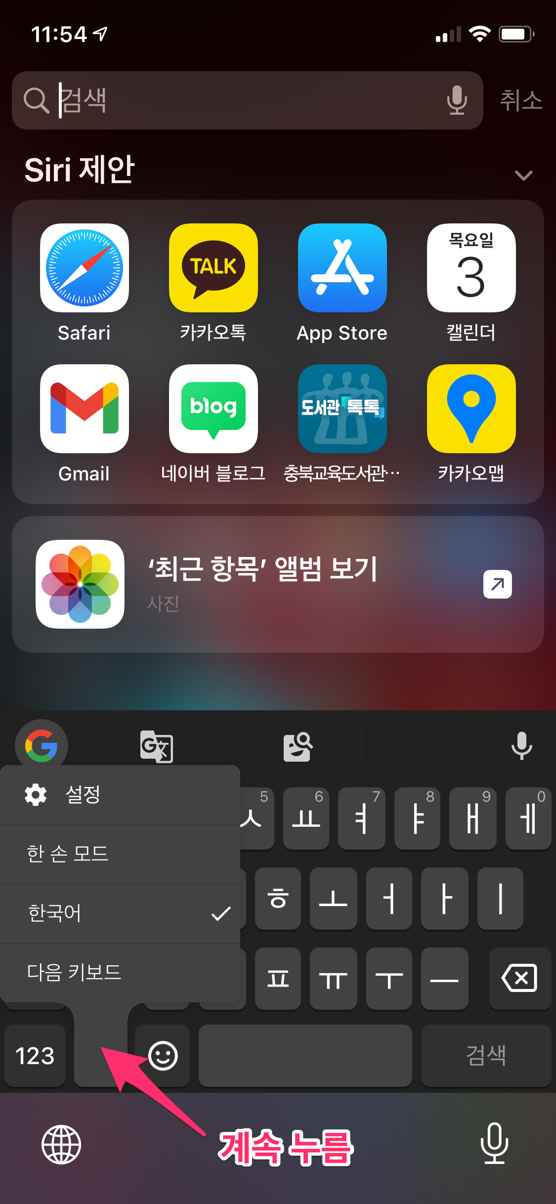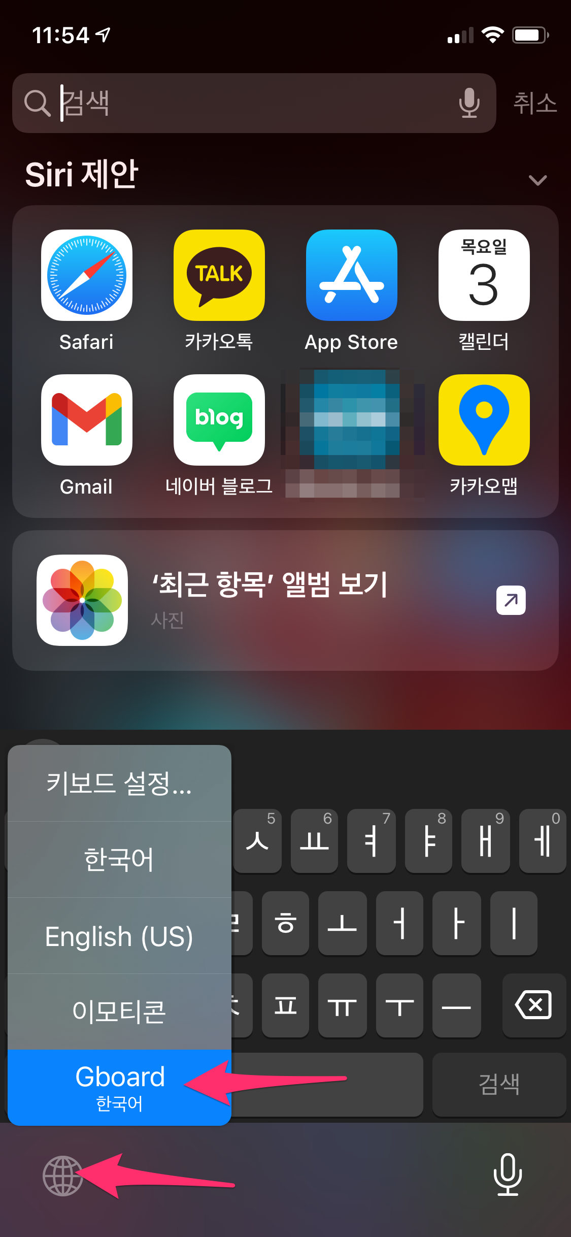 자판이 나오면 지구본을 꾹~ 누르면 여러 가지 자판이 나옵니다. 그중에서 Gboard를 선택합니다.