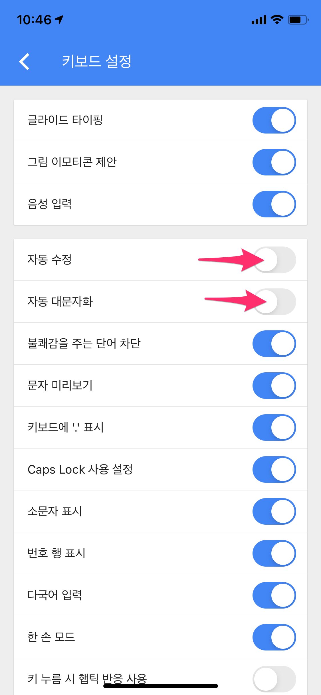 개인적으로 자동 수정과 자동 대문자화의 체크를 비활성화했습니다.