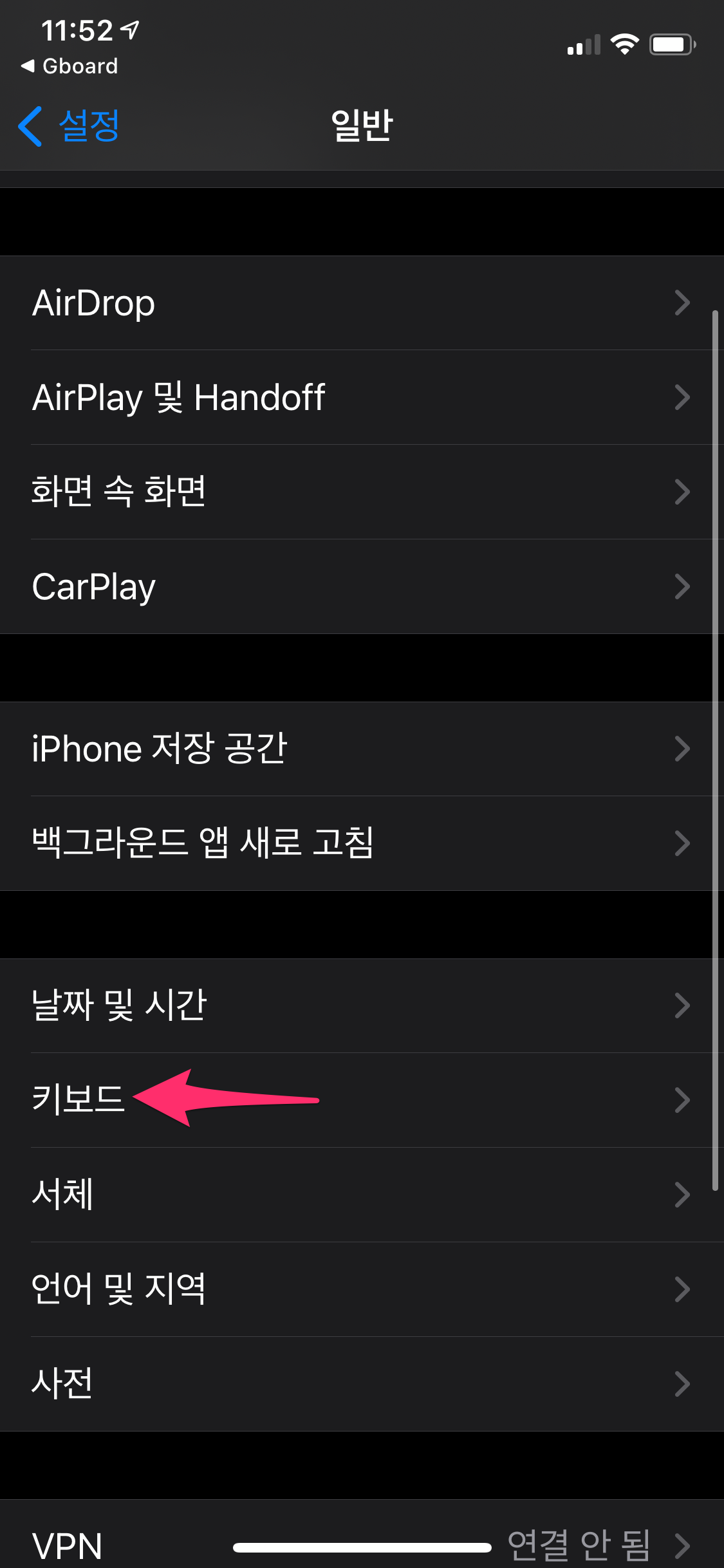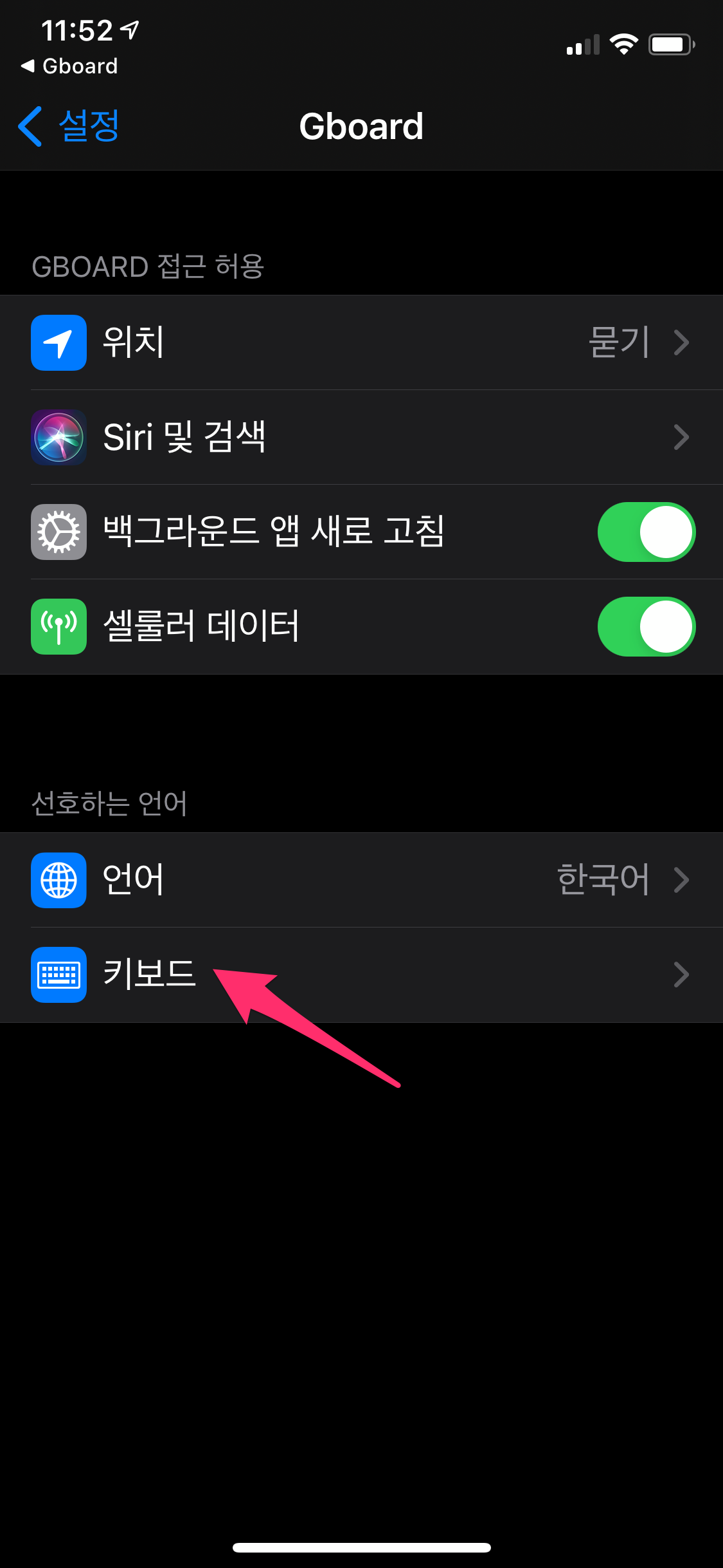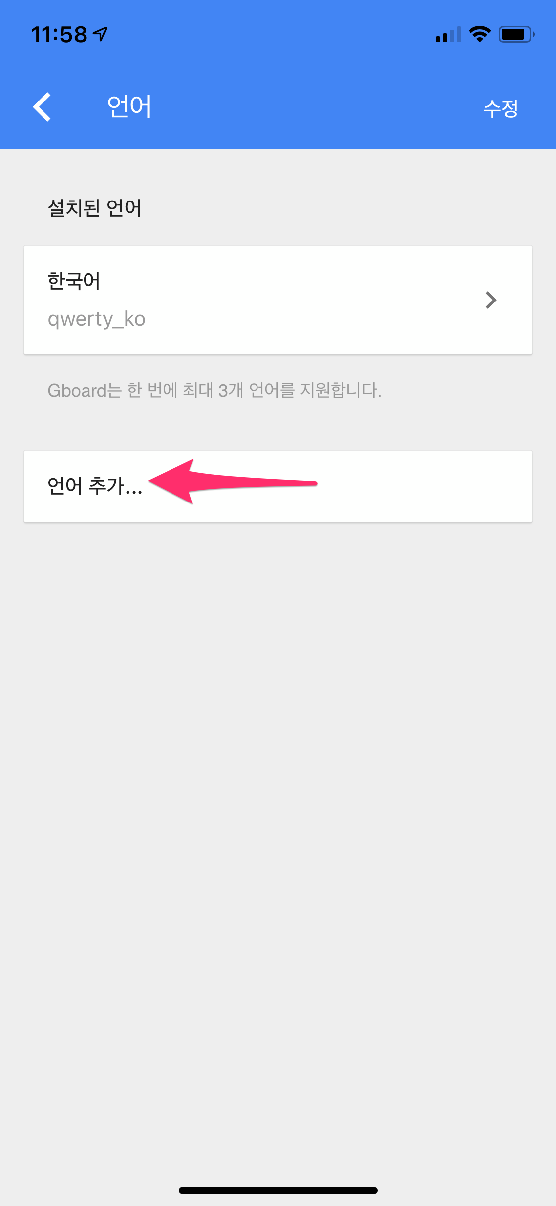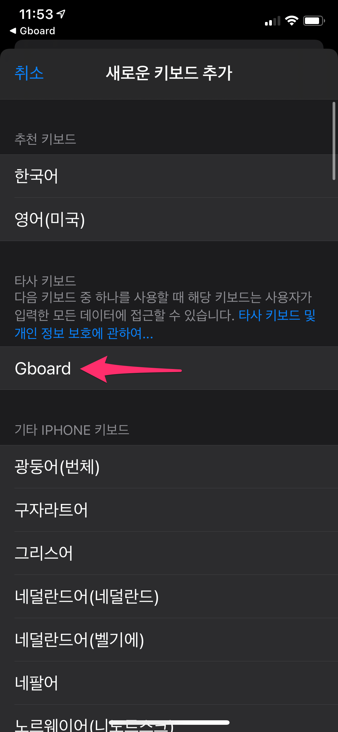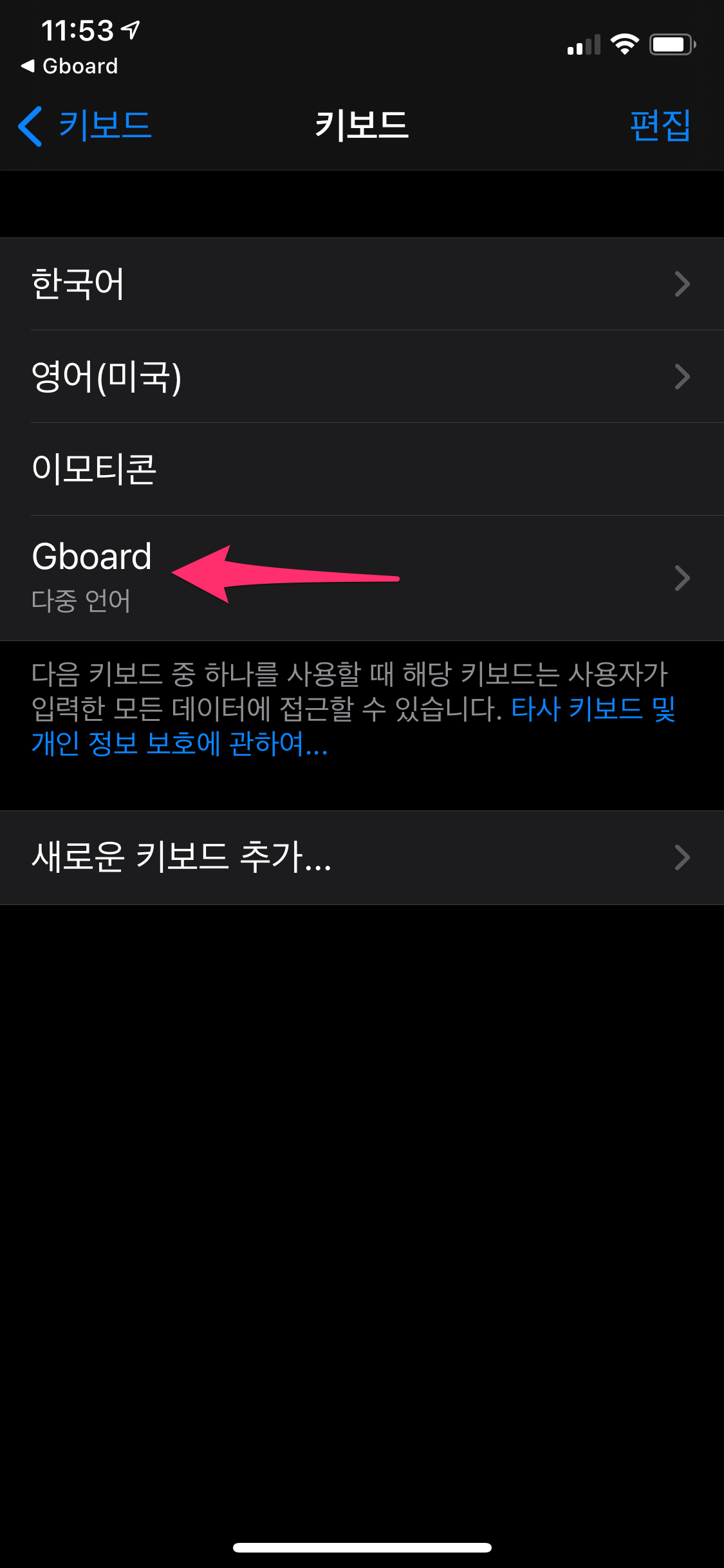 상단에 키보드를 선택한 후에 Gboard를 선택하여 추가합니다.
