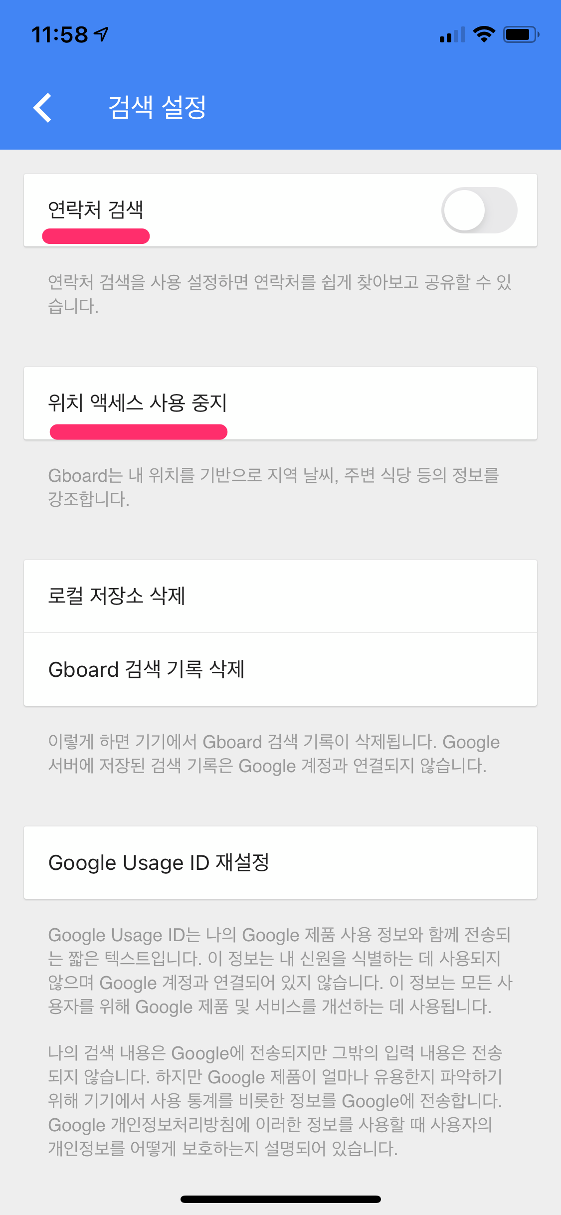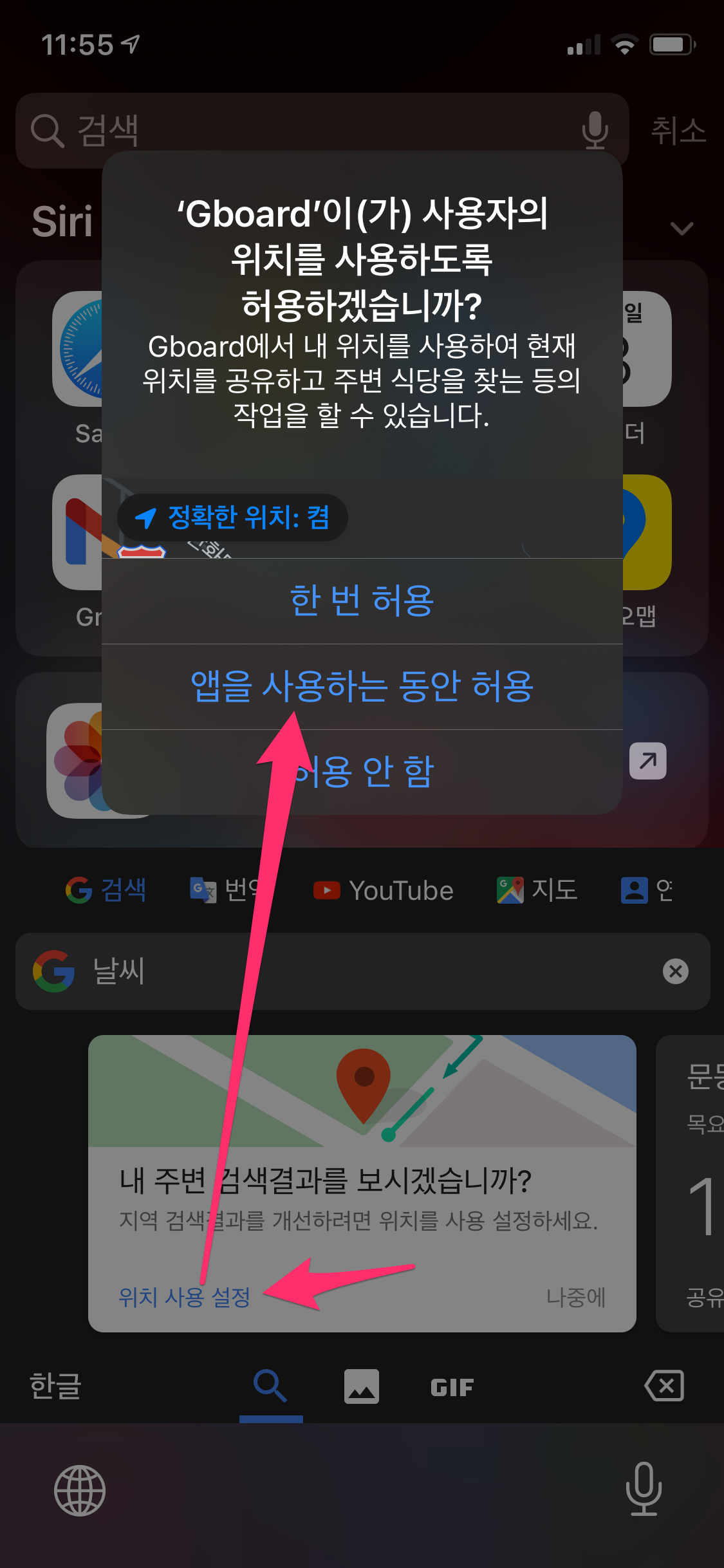 Gboard 자판에서 연락처 검색과 위치 액세스 가능 여부를 결정하시길 바랍니다.