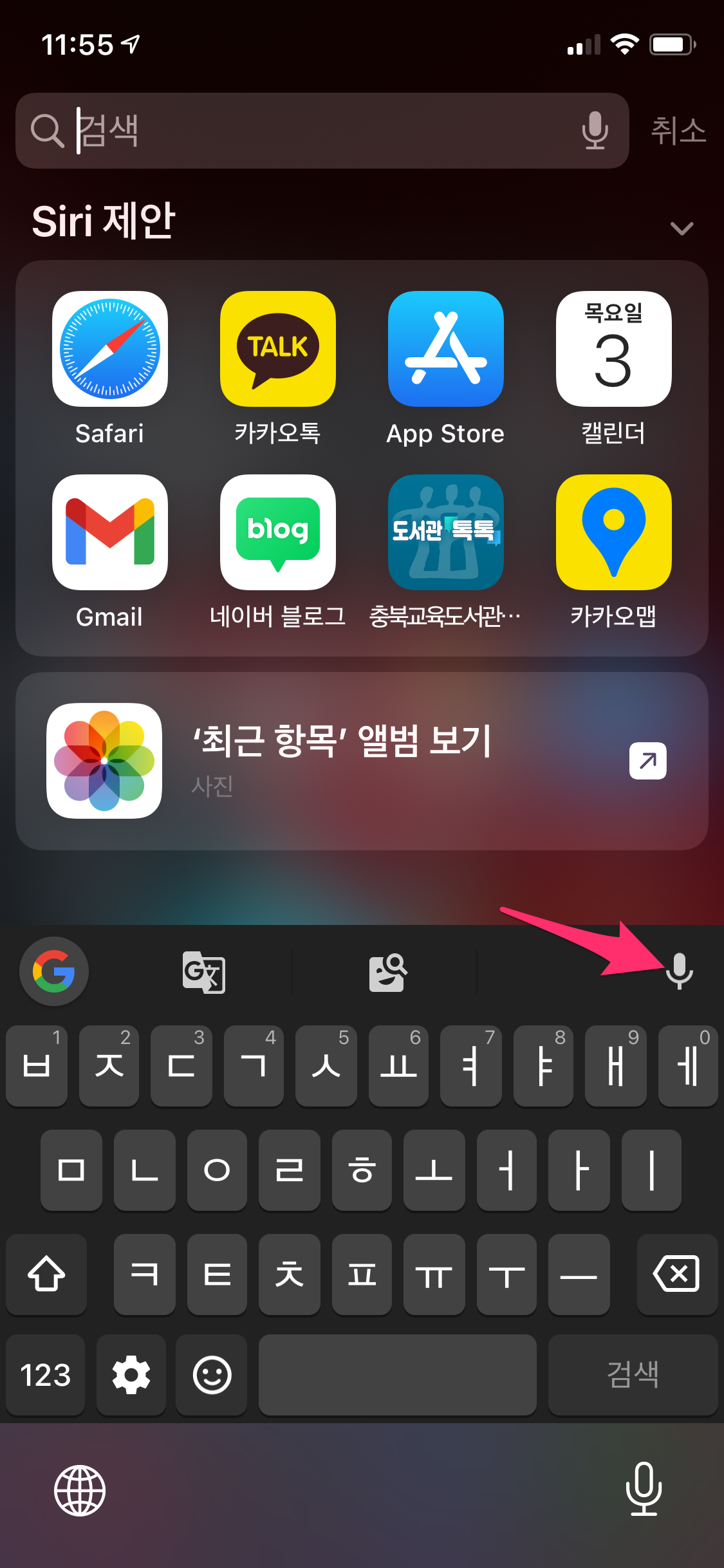 음성 검색 아이콘을 선택하면 음성으로 검색이 가능합니다.