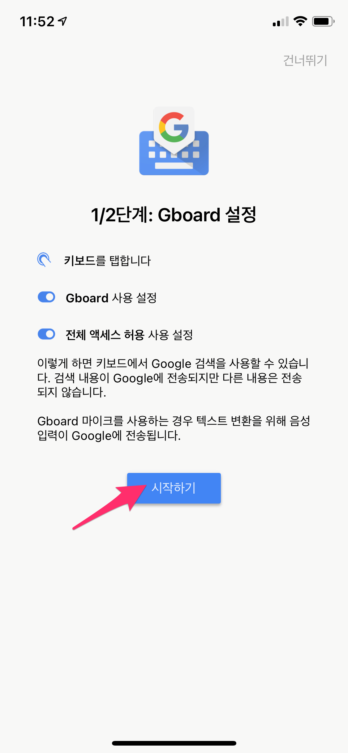 Gboard 설정 안내문을 참고하시고 시작하기 버튼을 선택한 후에 키보드를 선택하고 전체 접근 허용을 체크하시면 됩니다.