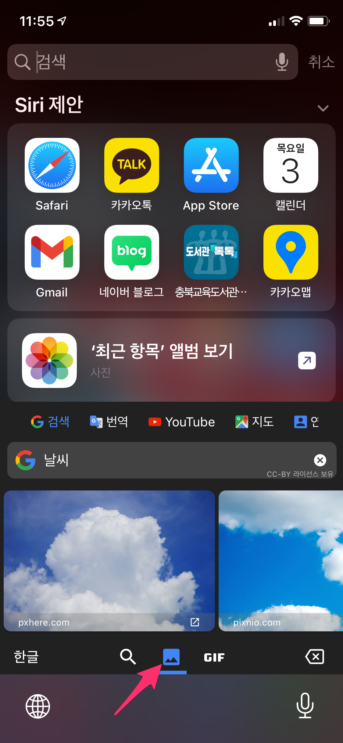 또한 하단에 이미지를 누르면 날씨라는 단어의 이미지가 검색됩니다.