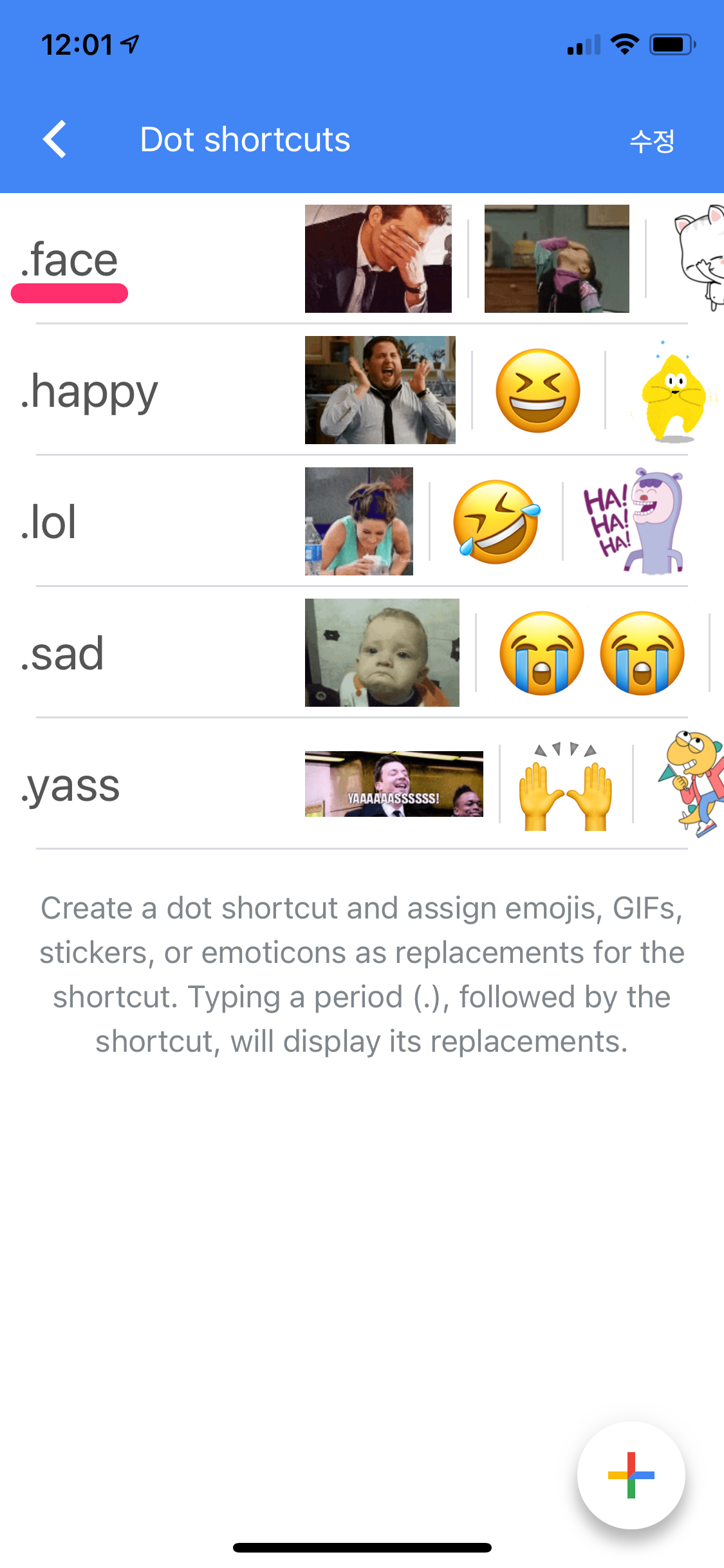 가령 자판에 .face를 입력하면서 자동으로 face에 관련된 이모지나 gif, 스티커 목록이 나옵니다.