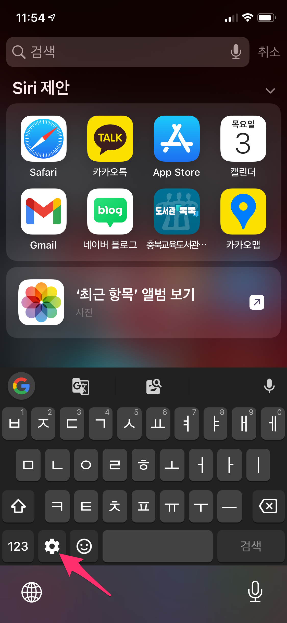 Gboard가 선택된 상태에서 이제는 톱니바퀴를 선택하면 아까 설정에서 추가된 언어인 영어와 한국어로 자판이 전환됩니다.