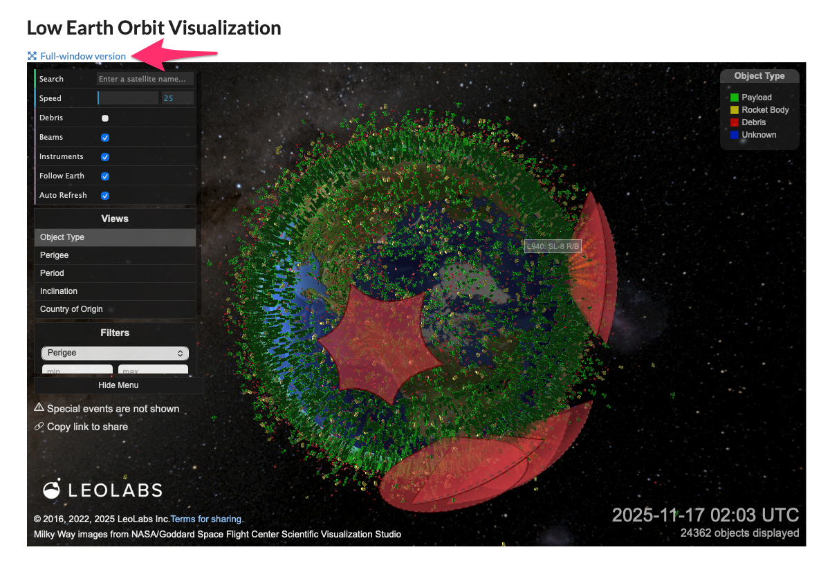 Low Earth Orbit Visualization(저궤도 시각화) 창에서 Full-window version를 클릭합니다.