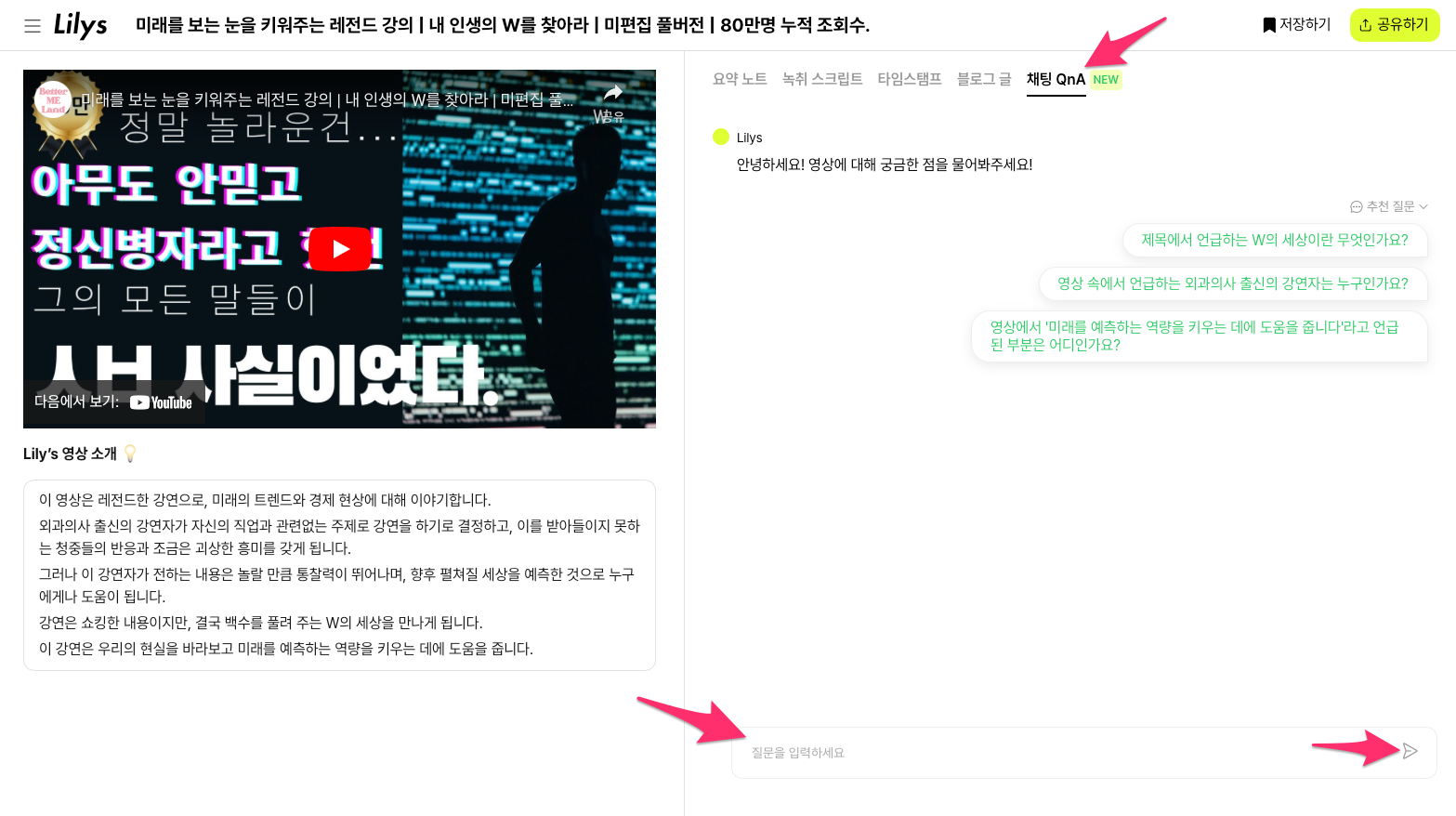 이렇게 채팅창에 Lilys AI 를 선택한 후에 채팅창에 유튜브 주소를 붙여 넣기 합니다.