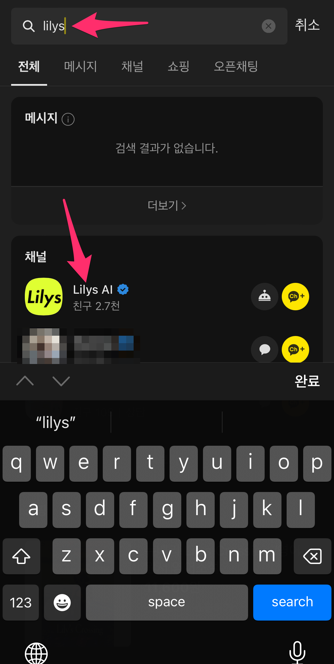 우선 카톡에서 Lilys AI 를 검색하여 채널을 선택합니다.