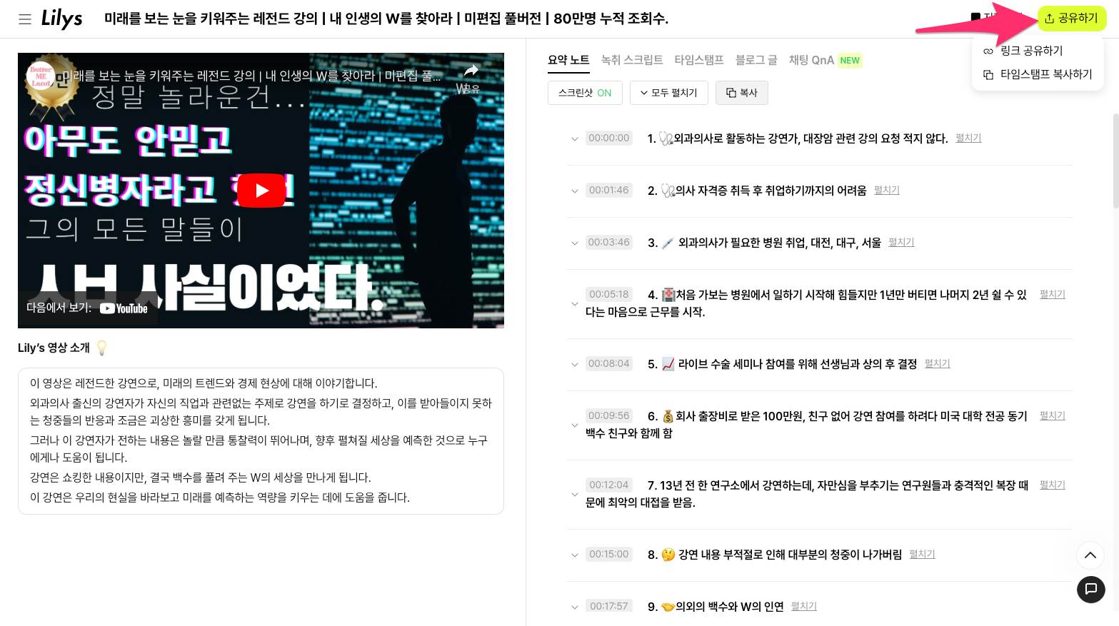 상단 공유하기 버튼을 선택하면 링크를 공유하거나 타임스탬프를 복사할 수 있습니다.