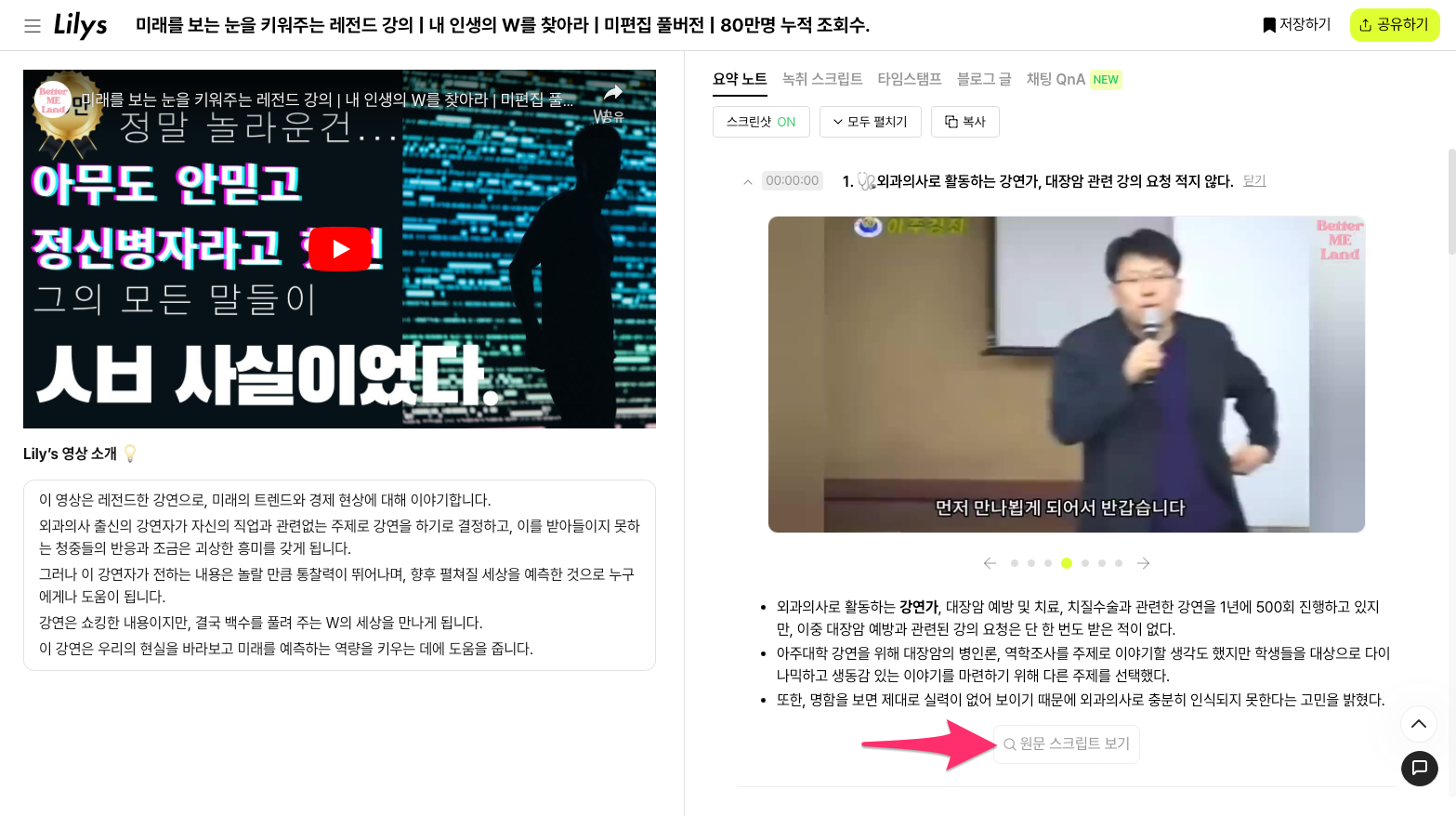 원본 스크립트 보기를 선택하면 녹취본을 확인할 수 있습니다.