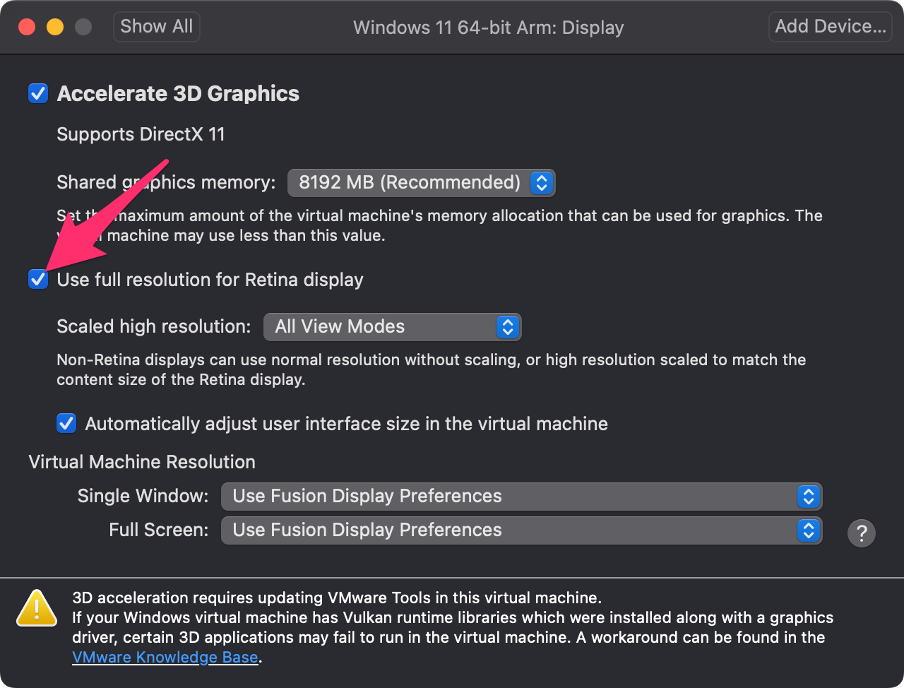 중간에 Use full resolution for Retina display를 체크한 후에 다시 Windows를 가동합니다.