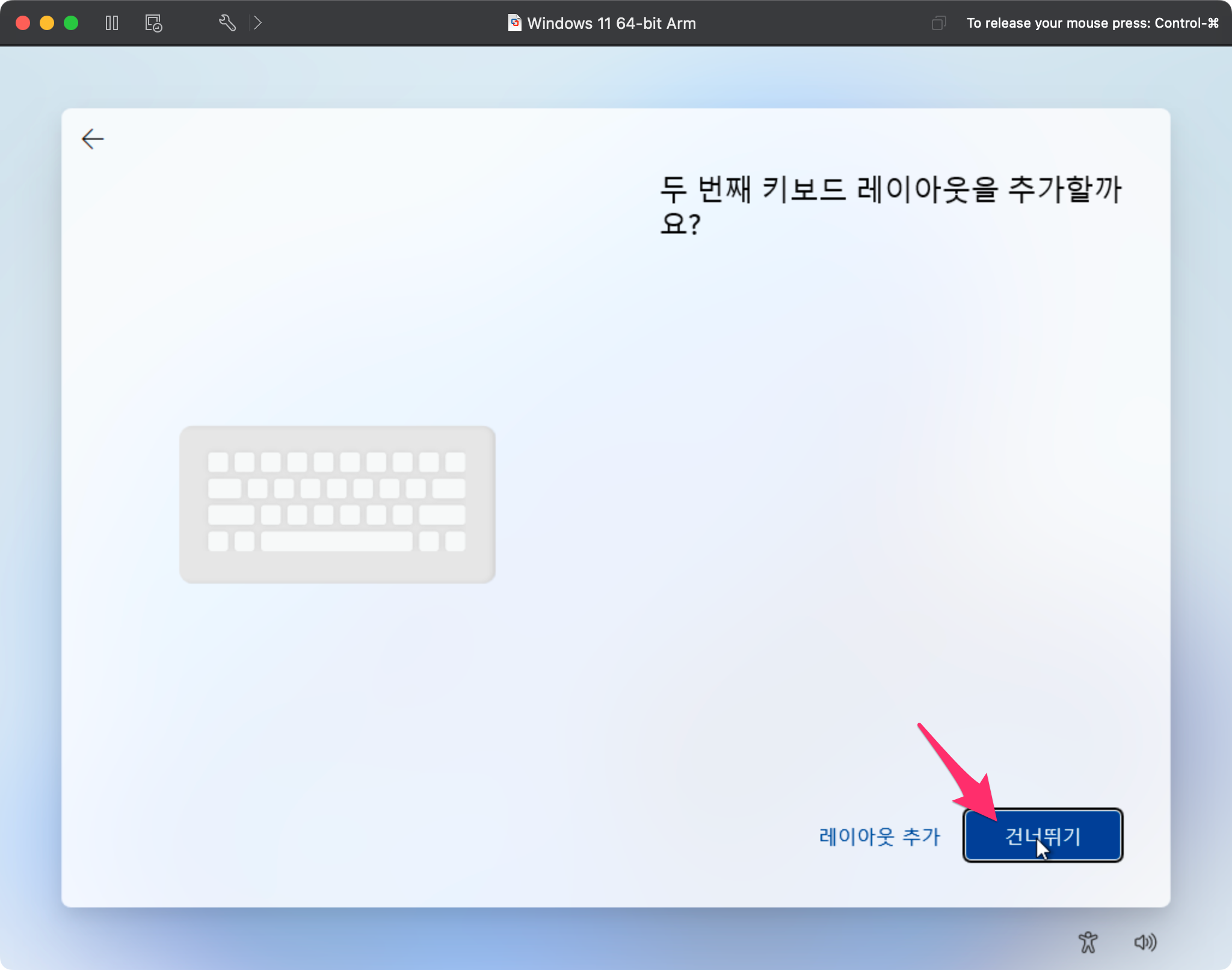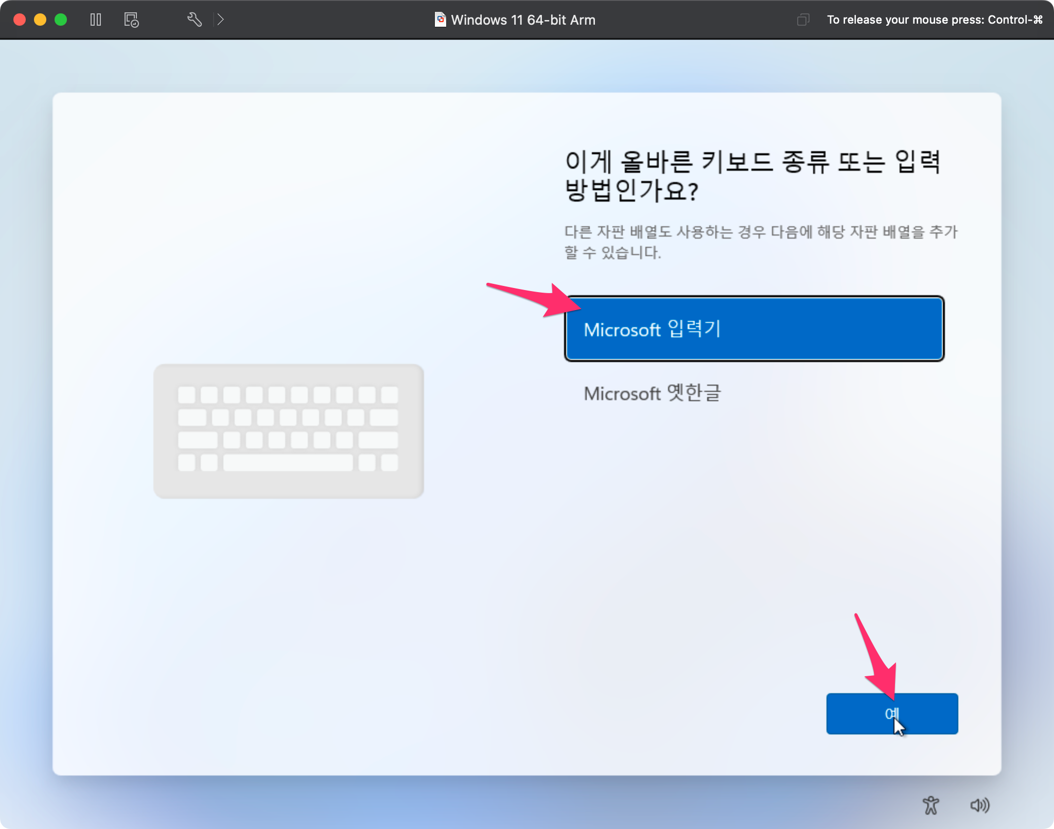 Microsoft 입력기를 선택하고 두 번째 키보드 레이아웃은 건너뛰기 합니다.