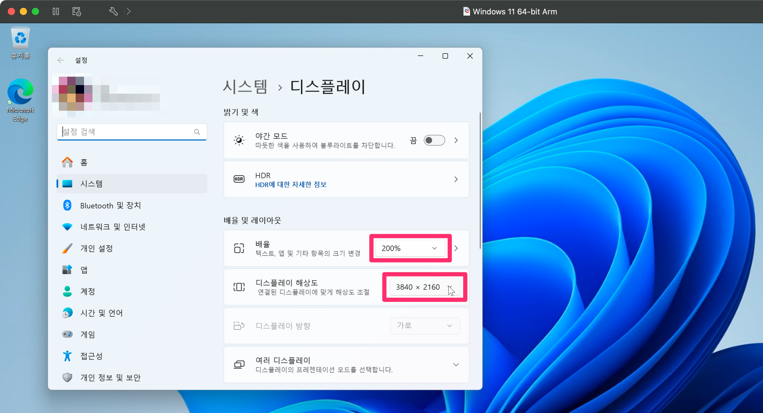 배율 및 레이아웃에서 배율은 200%, 디스플레이 해상도는 3840 x 2160으로 설정했습니다.