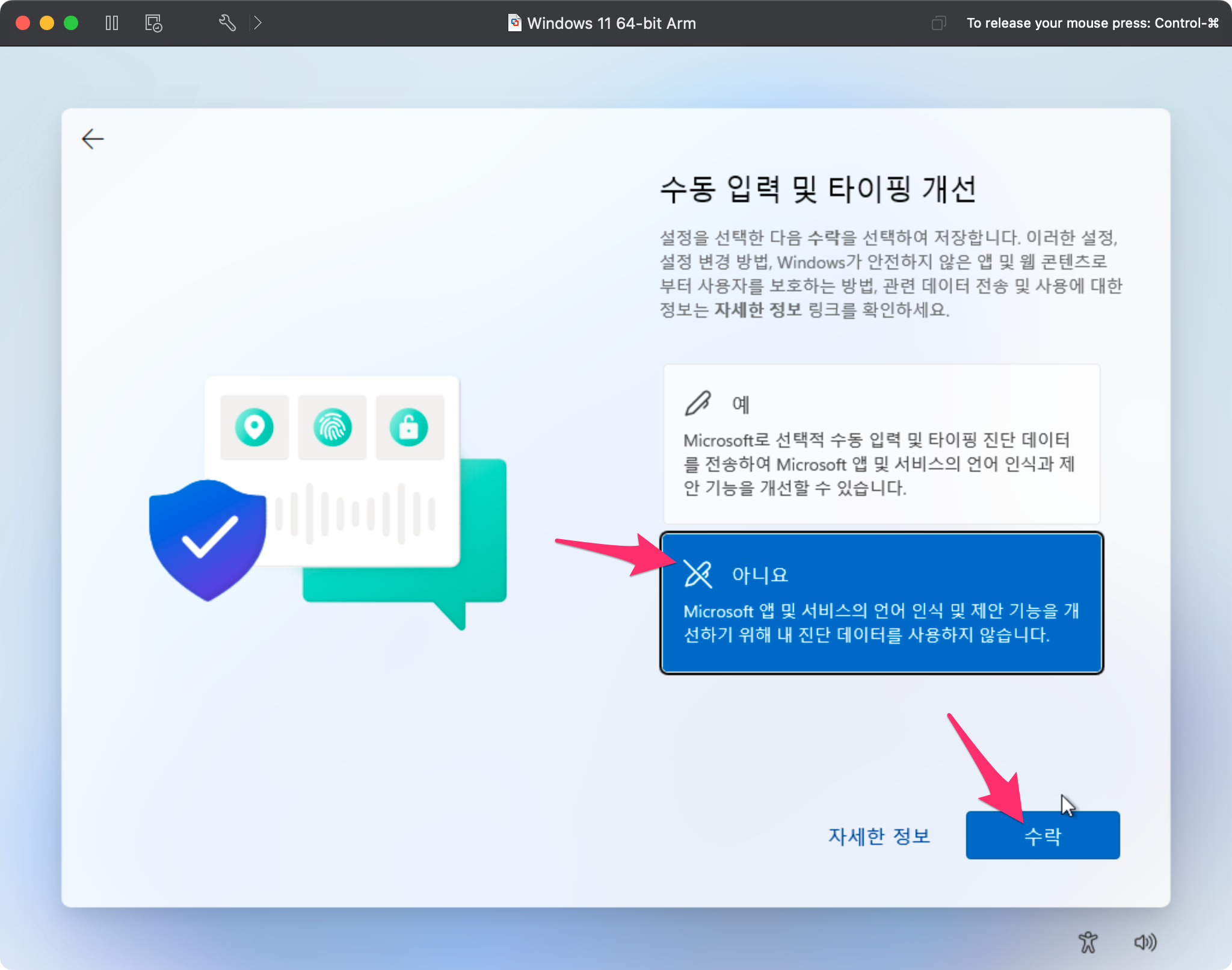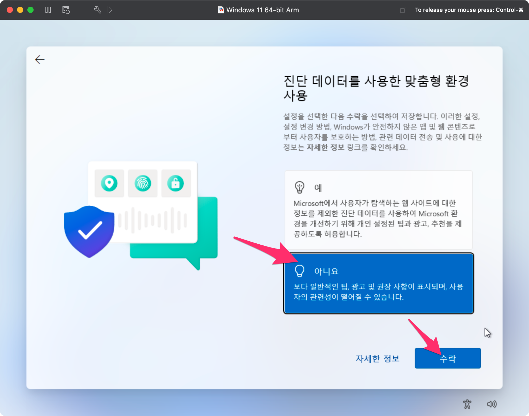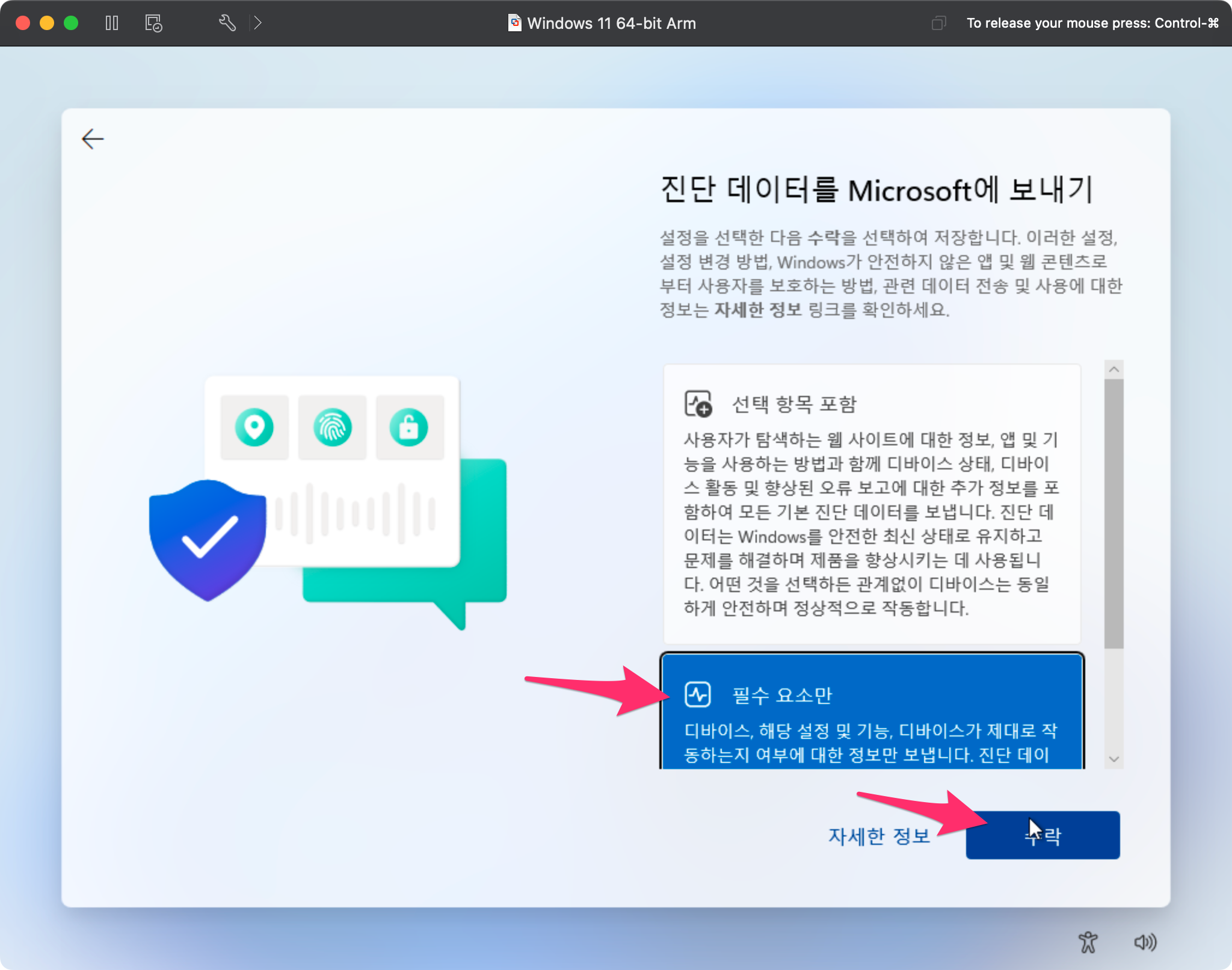 Windows 화면이 나오면 몇가지 세팅이 필요합니다.