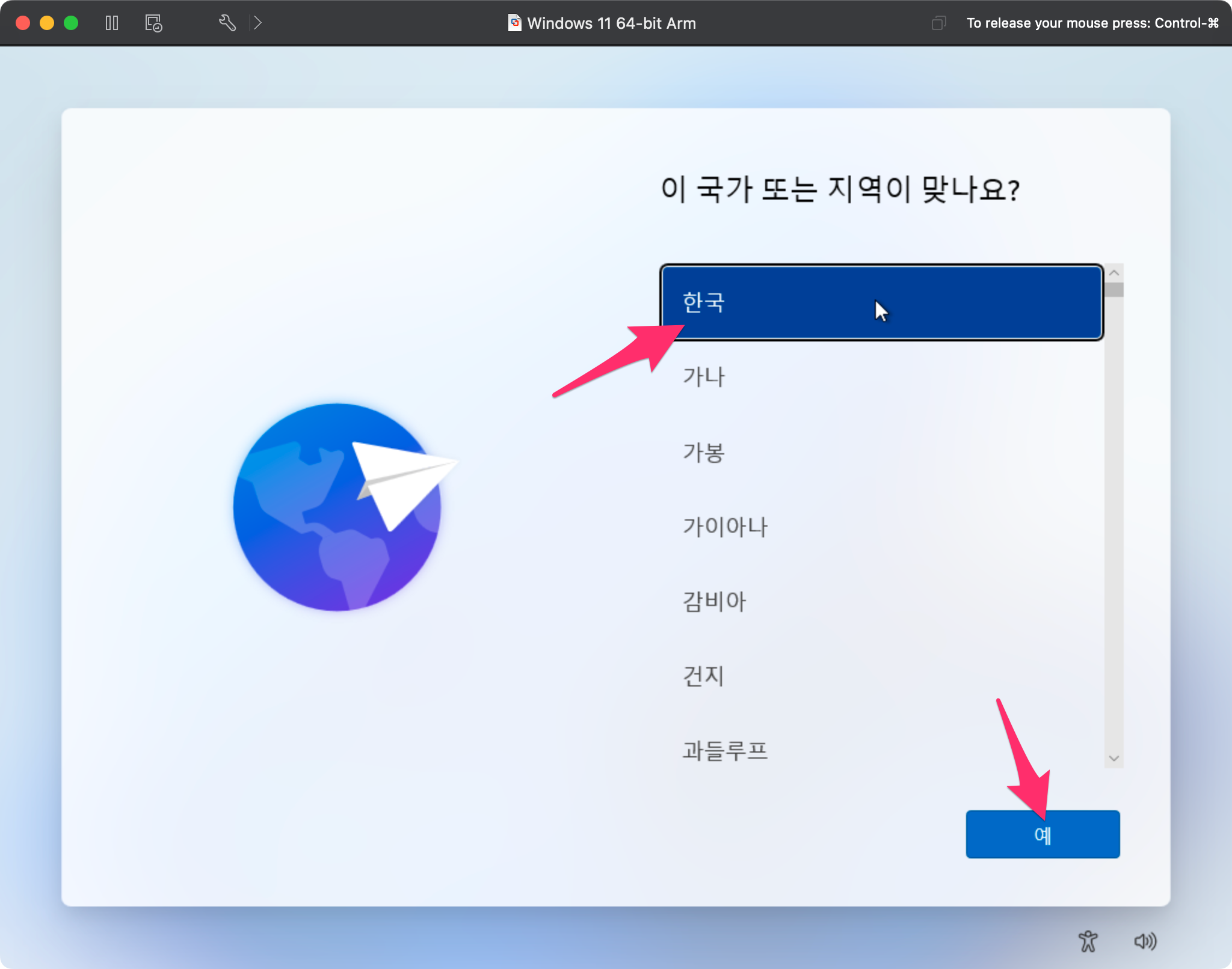 설치가 완료되면 국가는 한국으로 선택하고 예 버튼을 선택합니다.
