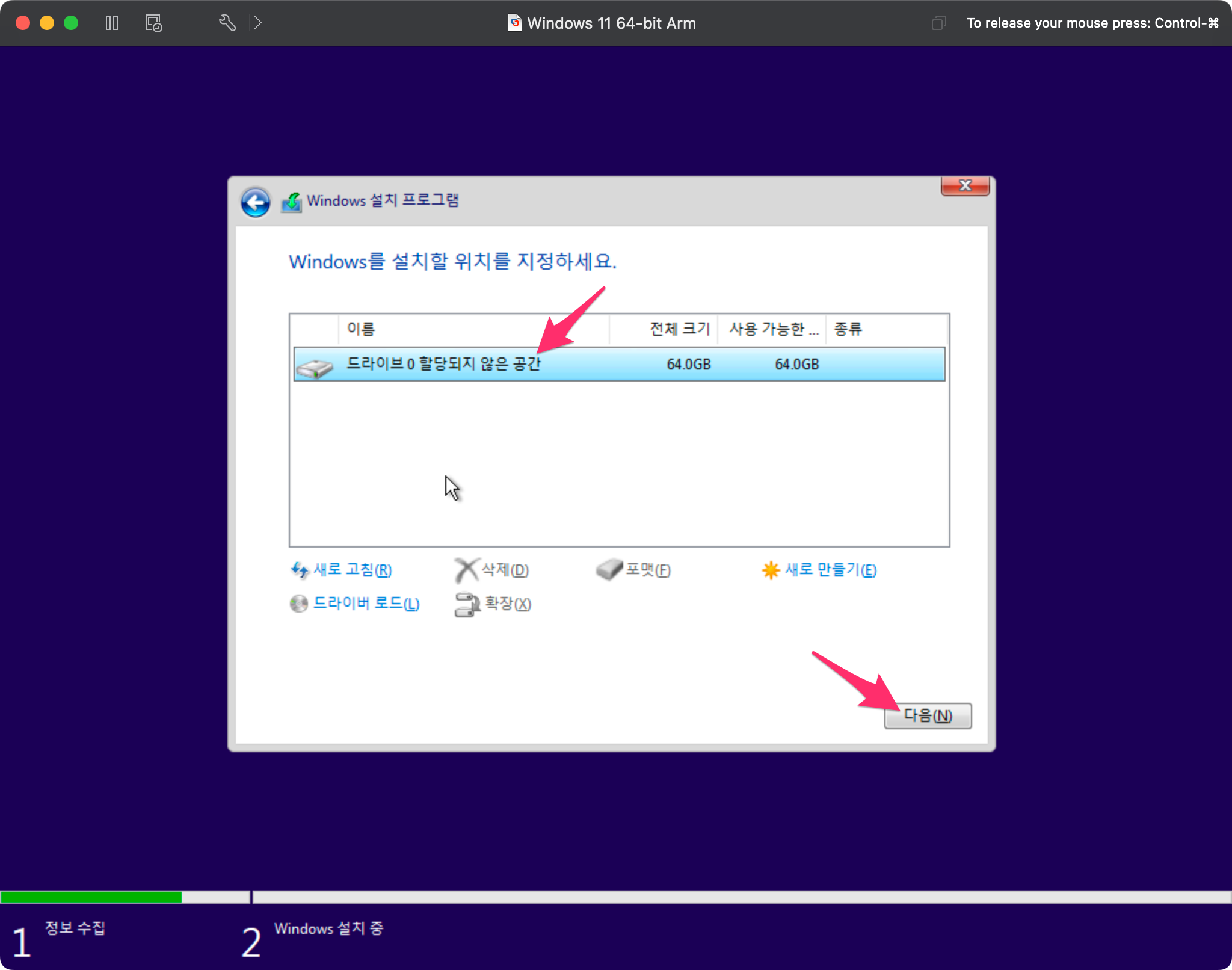 드라이브는 어차피 1개라서 가볍게 다음 버튼을 선택하면 Windows가 설치됩니다.