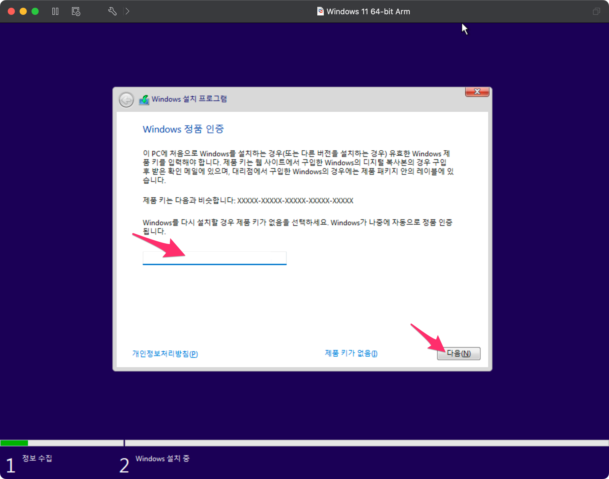 제품 키를 입력하고 다음 버튼을 선택합니다.