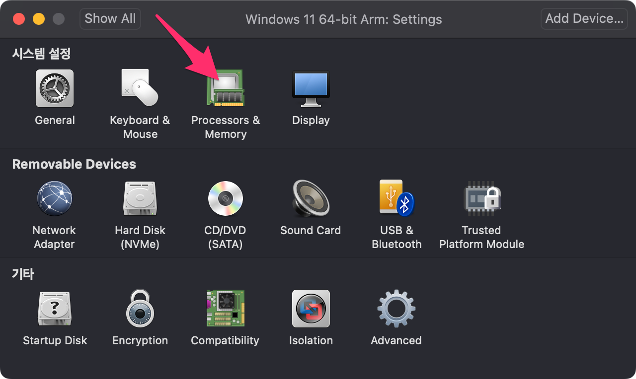 상단에 설정 아이콘을 선택한 후에 Processors & Memory 를 선택합니다.