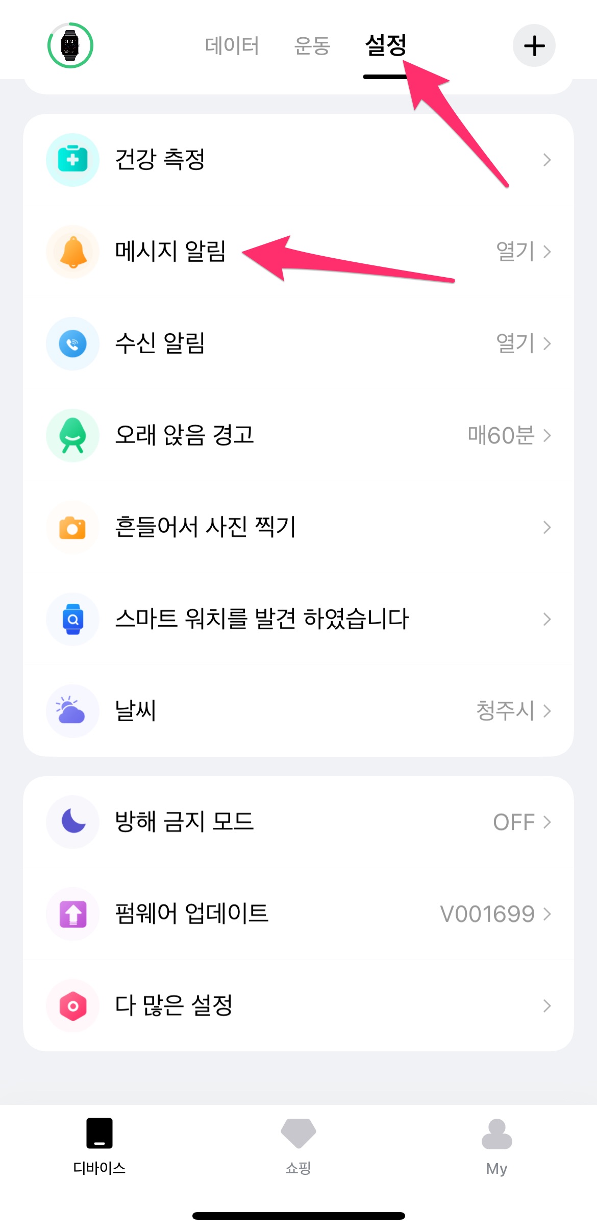 연동이 완료되면 상단 워치 이미지를 선택을 하면 설정으로 들어갑니다.