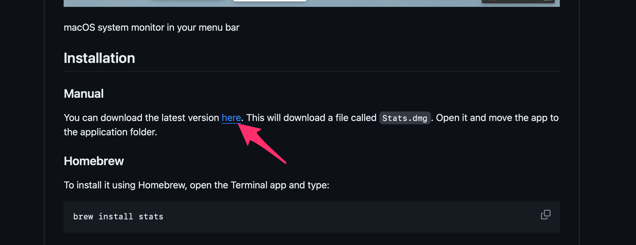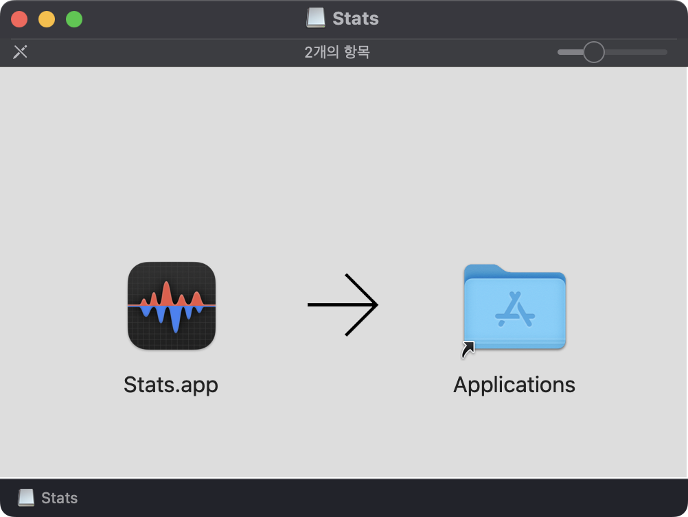 다운로드한 설치파일(dmg)을 실행한 후에 Stats.app를 Applications(응용 프로그램) 폴더로 이동시킵니다.