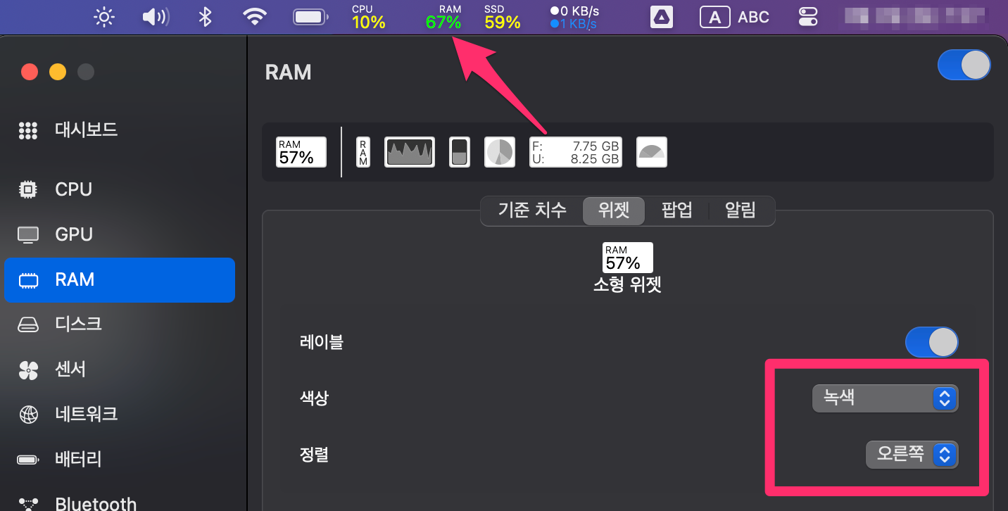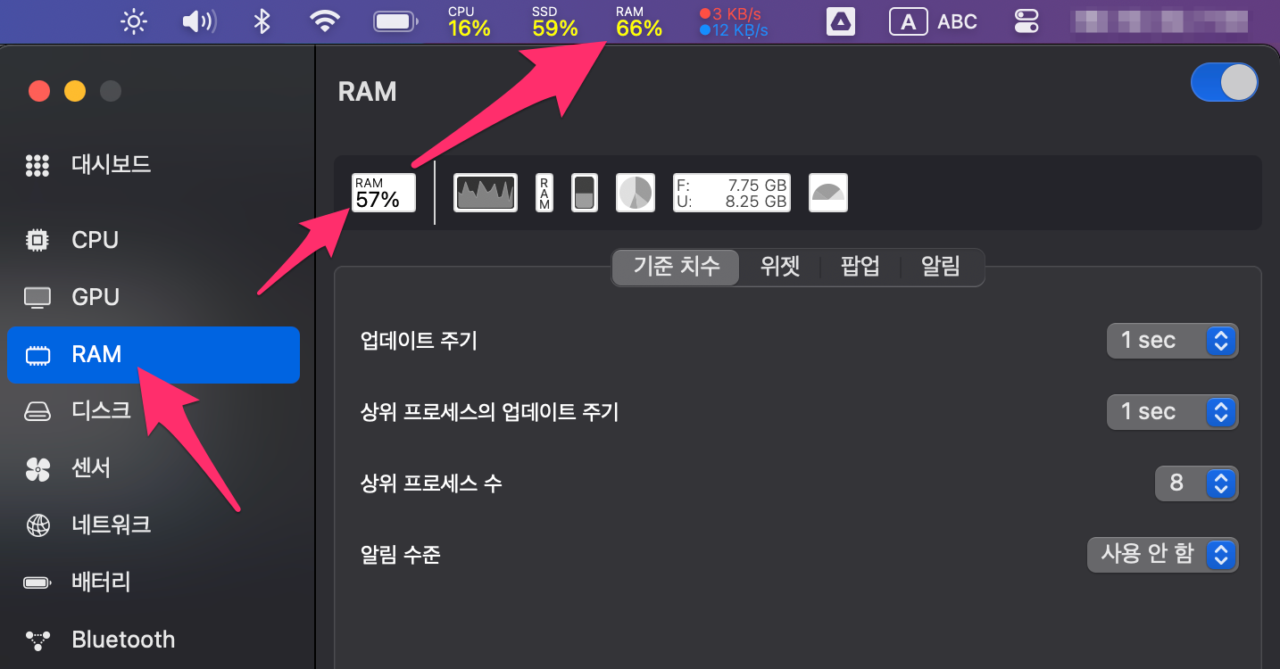 상단 메뉴바에 인터넷 속도, 디스크용량, CPU, RAM 사용량이 보입니다.