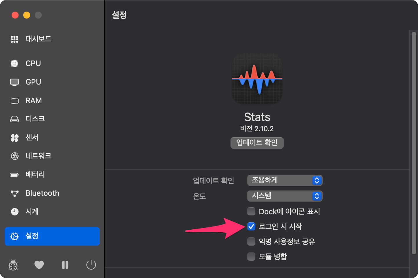 그리고 설정에 가시면 로그인 시 시작을 체크하시면 부팅될 때마다 자동으로 stats가 시작됩니다.