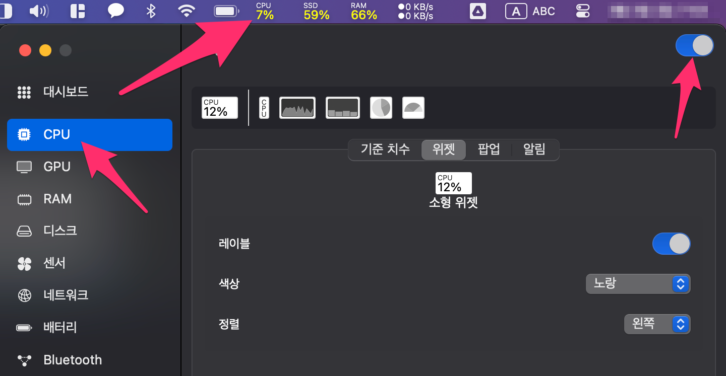 만약 CPU 상황을 보이게 하려면 CPU를 선택하고 창 오른쪽에 있는 체크 버튼을 선택하면 상단 메뉴바에 나타납니다.