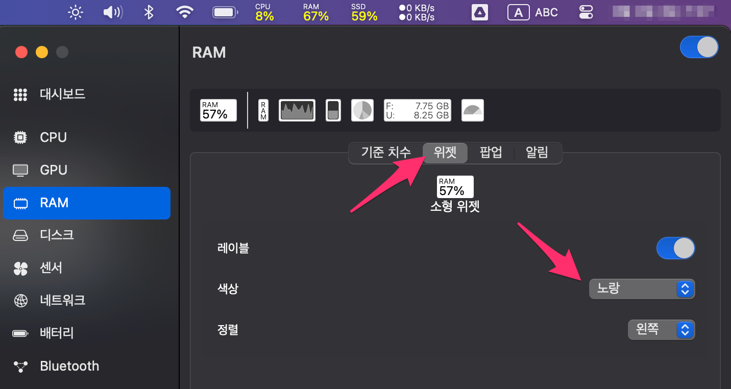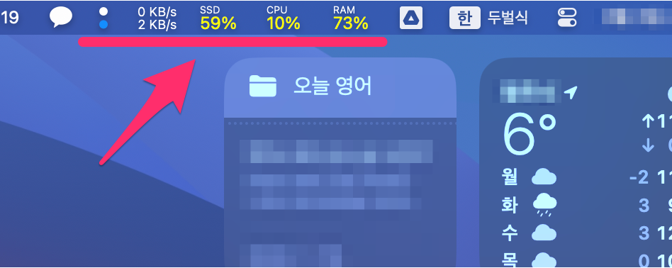 상단 메뉴바에 인터넷 속도, 디스크용량, CPU, RAM 사용량이 보입니다.