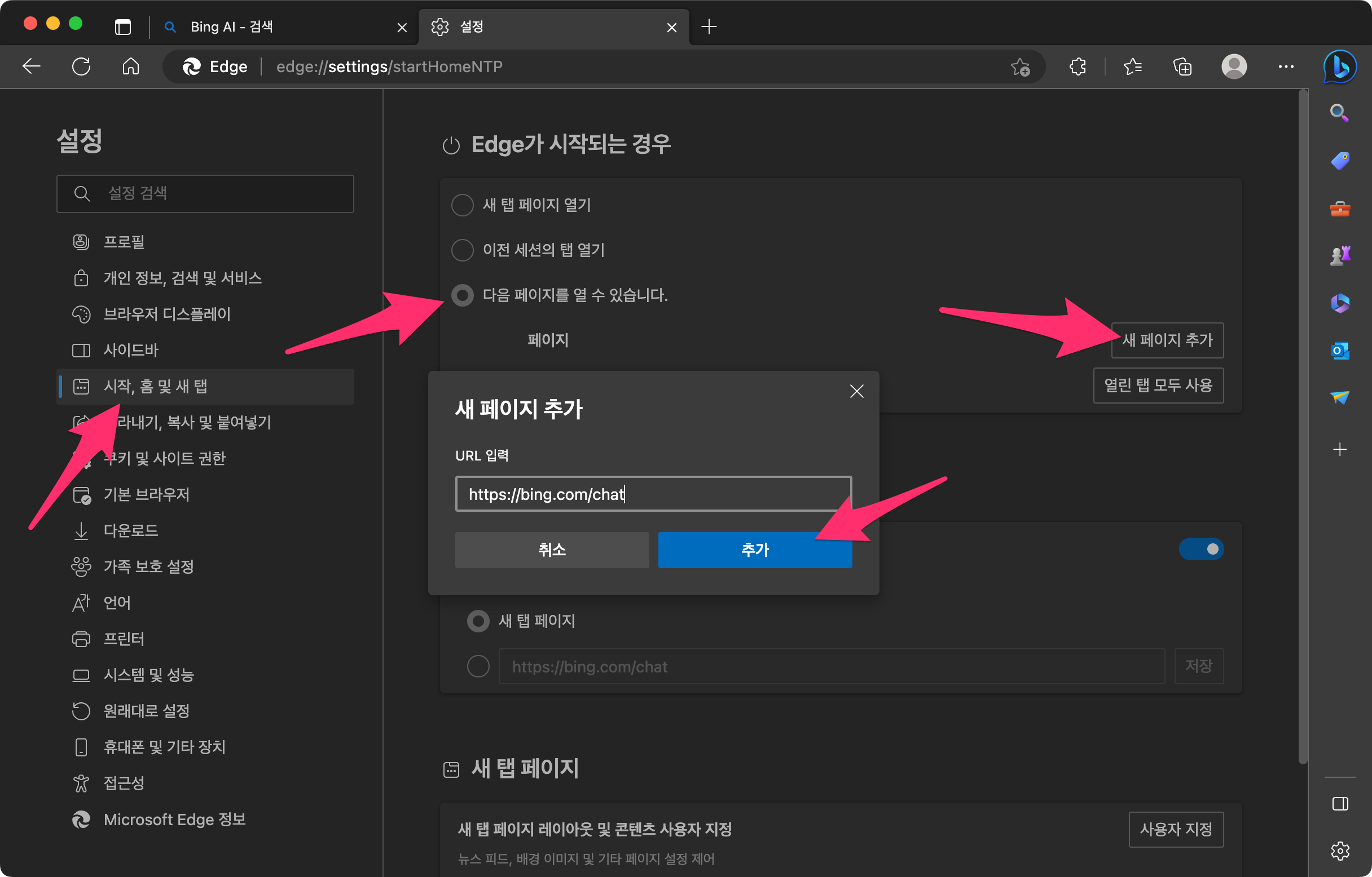 다시 홈 단추에서 https://bing.com/chat 를 입력하고 저장합니다.