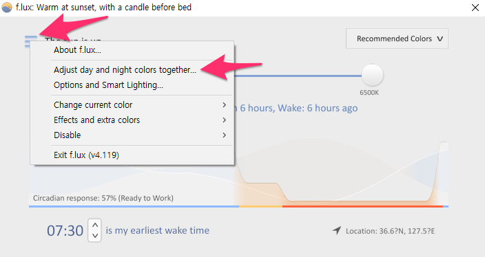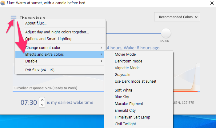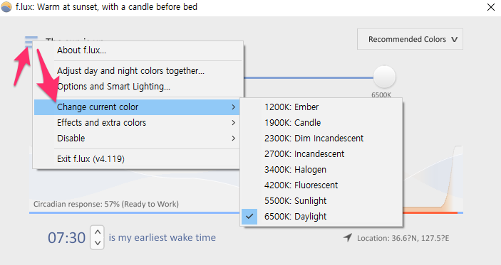 또한 f.lux 아이콘을 오른쪽 마우스로 클릭하면 메뉴가 나옵니다.