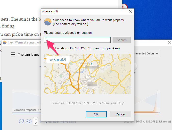 재부팅이 끝나고 윈도우 하단에 더 보기를 선택한 후에 f.lux를 왼쪽 마우스로 클릭하면 메인 창이 나옵니다.