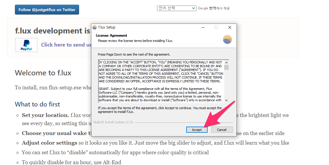 다운로드한 설치 파일로 f.lux를 설치합니다.