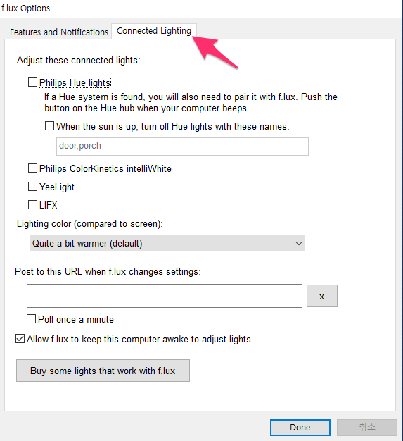 - post to this URL when f.lux changes settings f.lux가 설정을 변경할 때 URL에 게시