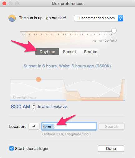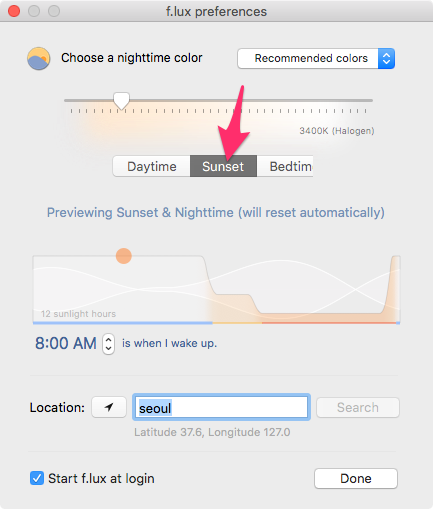 맥용 f.lux 설치나 운영하는 방법은 윈도우용과 동일하기 때문에 간략하게 설명하겠습니다.