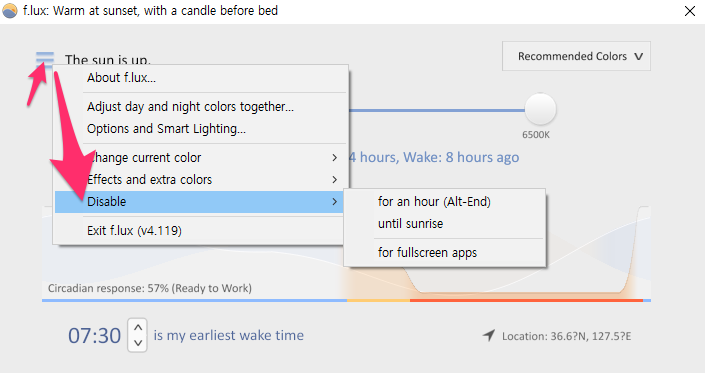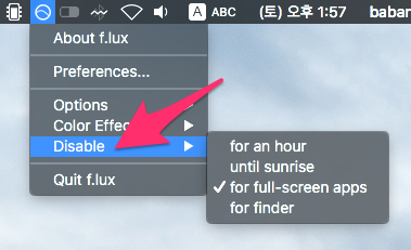 Disable(비활성)을 선택하여 for an hour(1시간 동안)이나 until sunrise(일출)까지 f.lux를 비활성화합니다.
