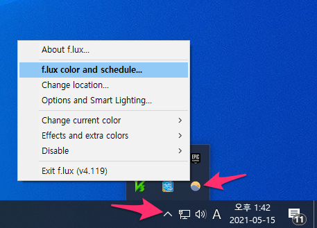 또한 f.lux 아이콘을 오른쪽 마우스로 클릭하면 메뉴가 나옵니다.