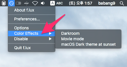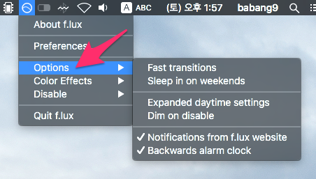 설치가 끝나면 상단 오른쪽에 f.lux 아이콘이 보입니다.