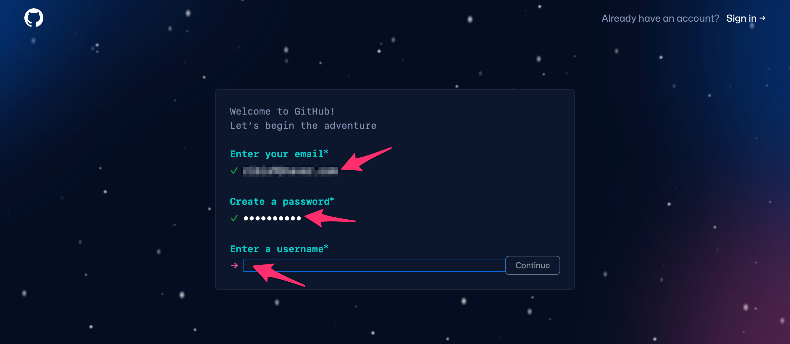 아까 GitHub 홈페이지에서 회원가입한 username과 email을 등록한 후에 완료를 선택합니다.