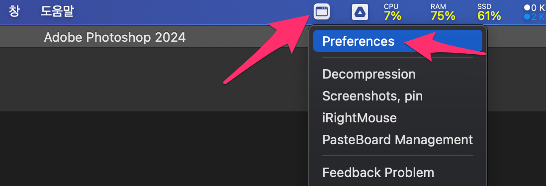 이렇게 하니 메뉴가 많은 프로그램을 실행해도 상단 메뉴 막대 밑에 나옵니다.