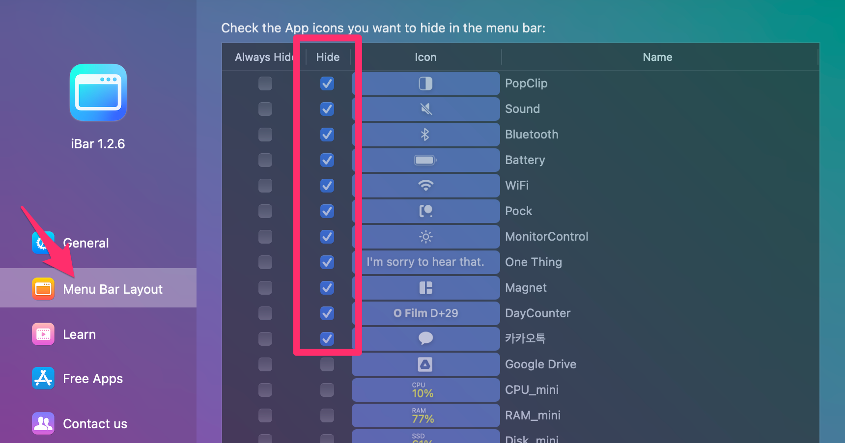 Menu Bar Layout 메뉴에는 숨길 메뉴 막대의 아이콘을 Hide 쪽에 체크하시면 아이콘이 숨기게 됩니다.
