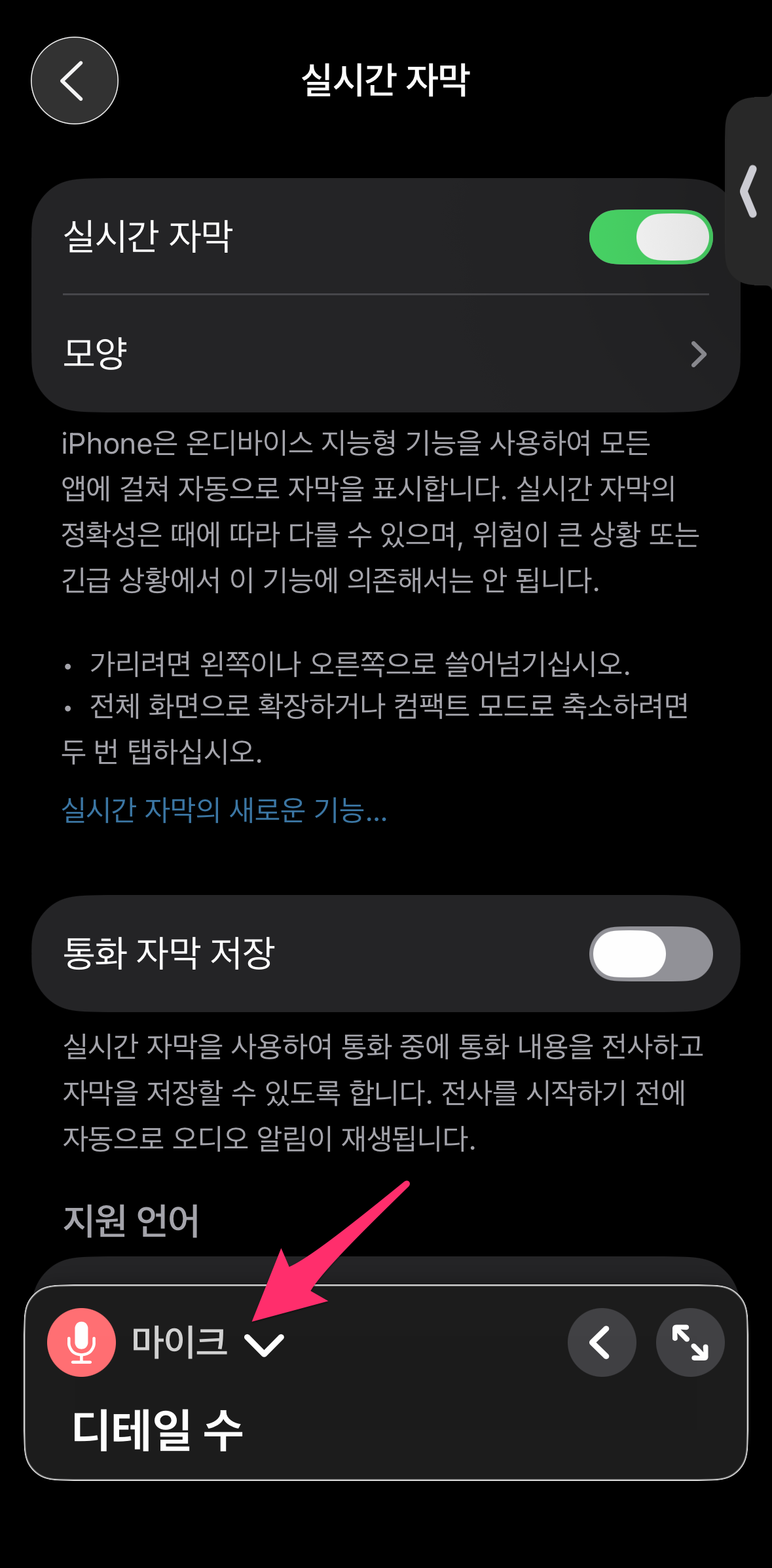 설정 > 손쉬운 사용에서 청각 지원의 실시간 자막 기능을 이용하면 아이폰 마이크나 에어팟 마이크를 통해 실시간 자막이 생성됩니다.