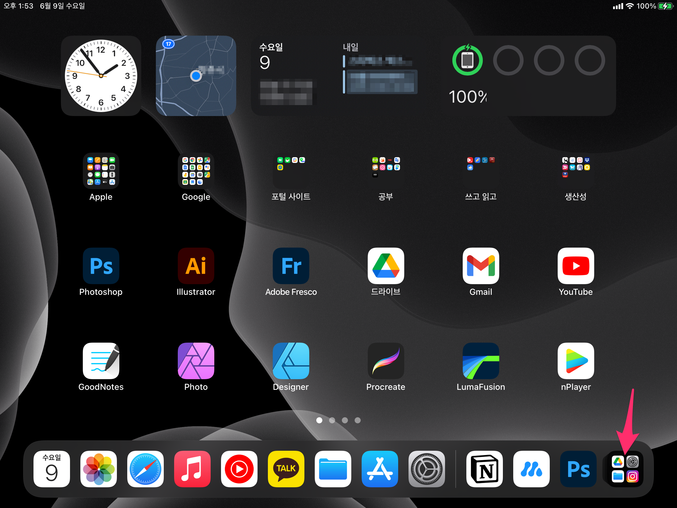iPadOS 15를 설치하고 첫 화면의 느낌은 위젯 위치가 바뀌고 하단 독 오른쪽에 아이콘이 눈에 들어와서 터치해봤습니다.