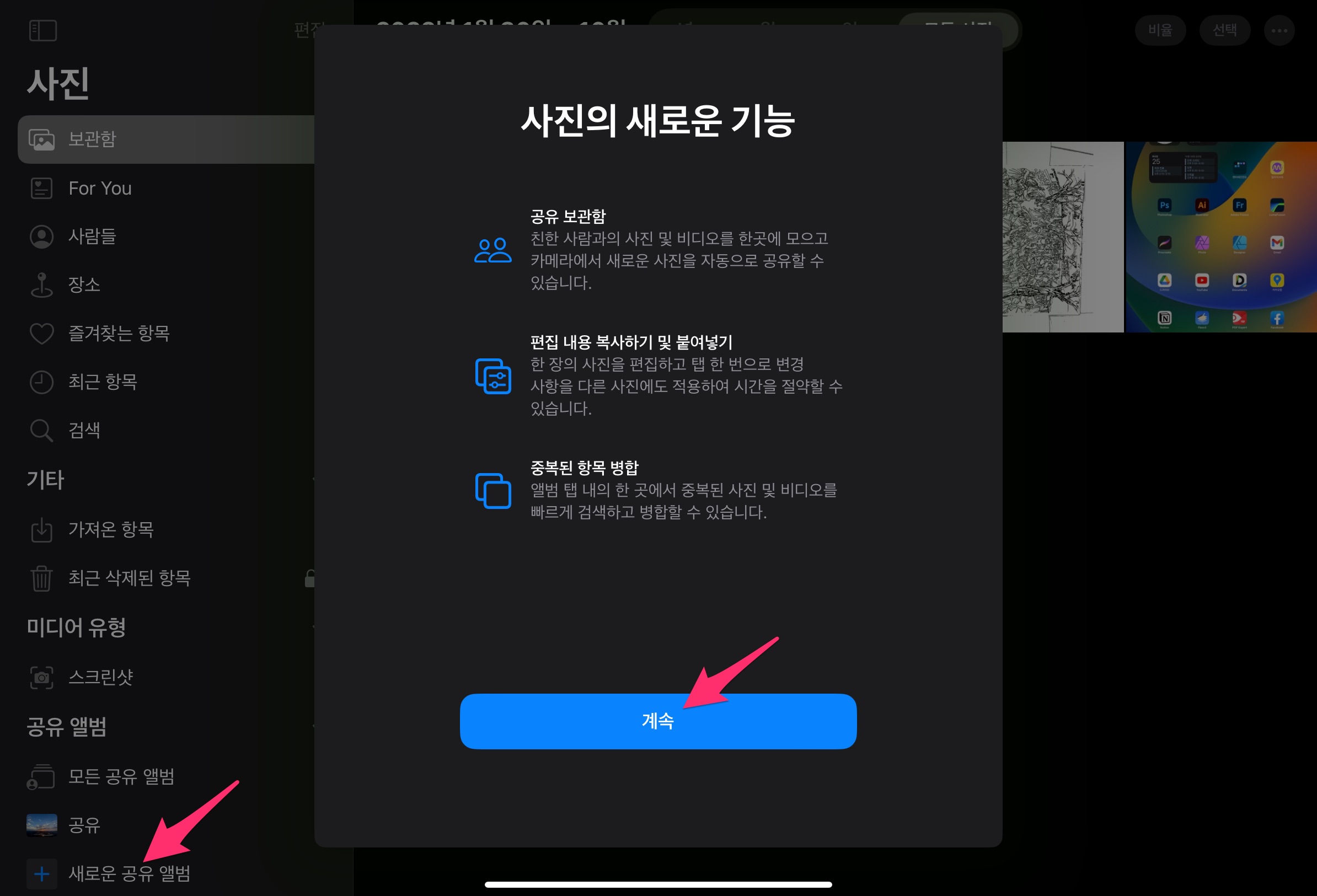 첫 번째로 소개하는 공유 보관함이 있네요. 우선 계속을 선택하고 왼쪽 공유 앨범에 있는 새로운 공유 앨범을 선택합니다.