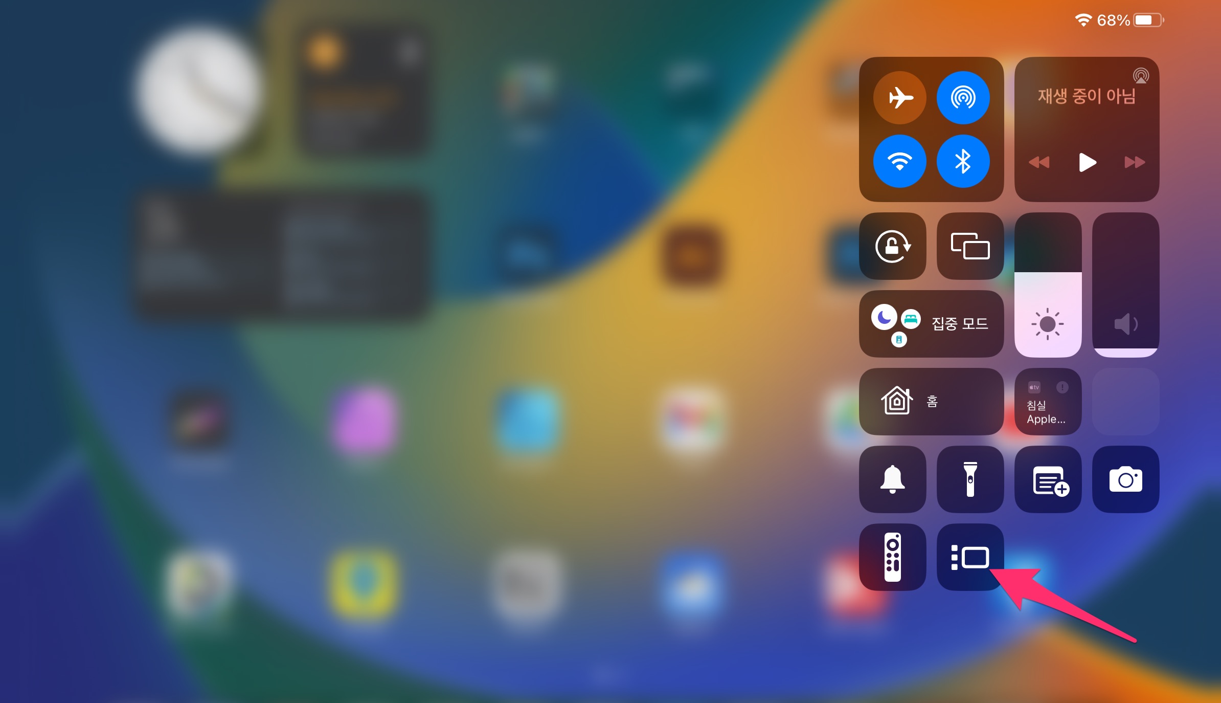 우선 오른쪽 상단을 손가락으로 슬라이딩하시면 제어 센터가 나옵니다.